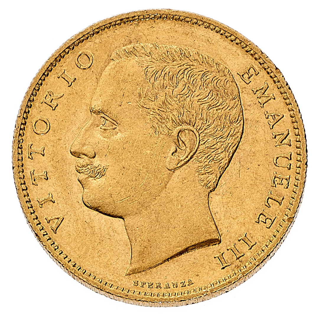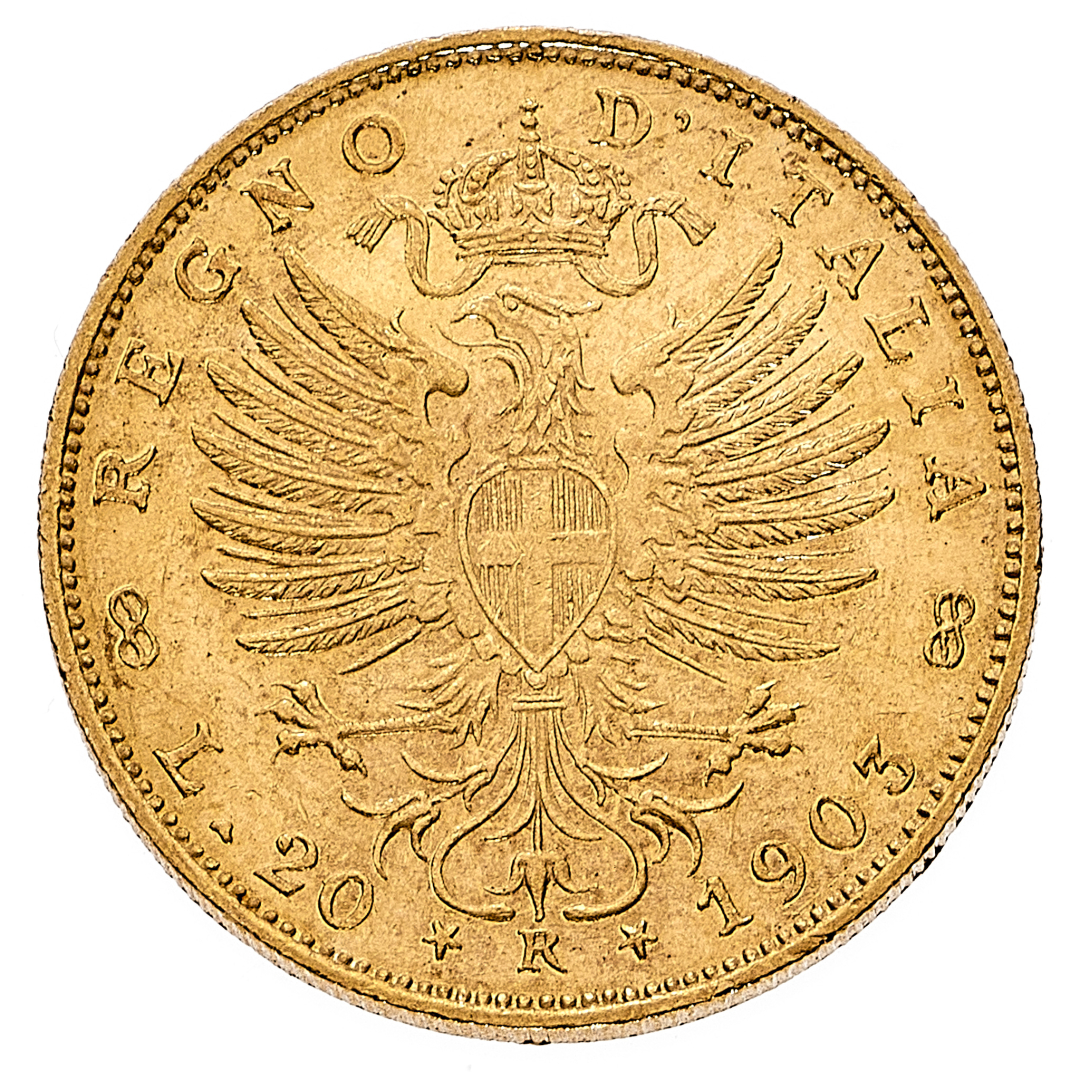 20 Lire Aquila Sabauda 1903 NGC MS 63 - Zecca: Roma - Diritto: effigie del Re a sinistra - Rovescio: aquila coronata ad ali spiegate con stemma sabaudo in petto - Rara - Cert. #8586305-004