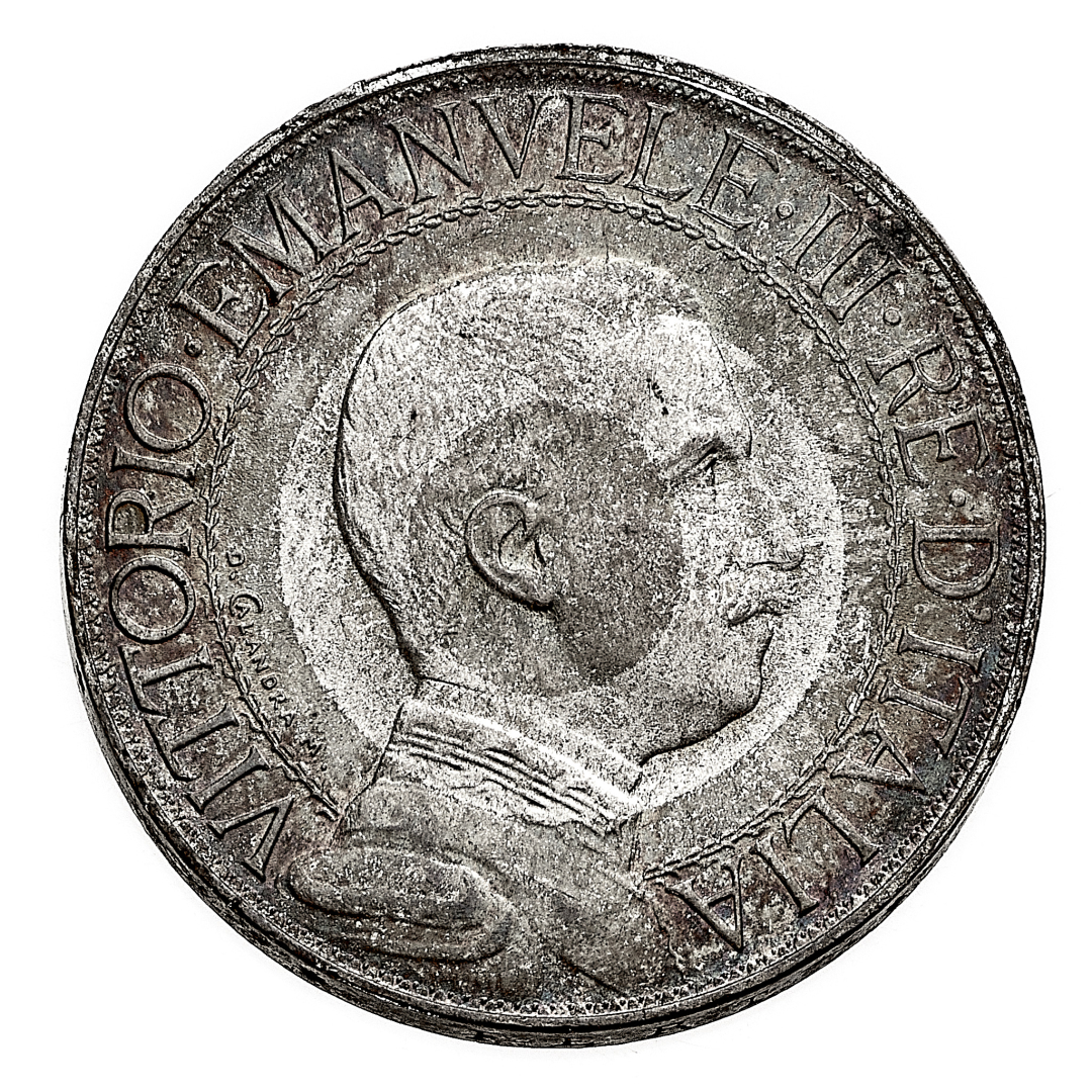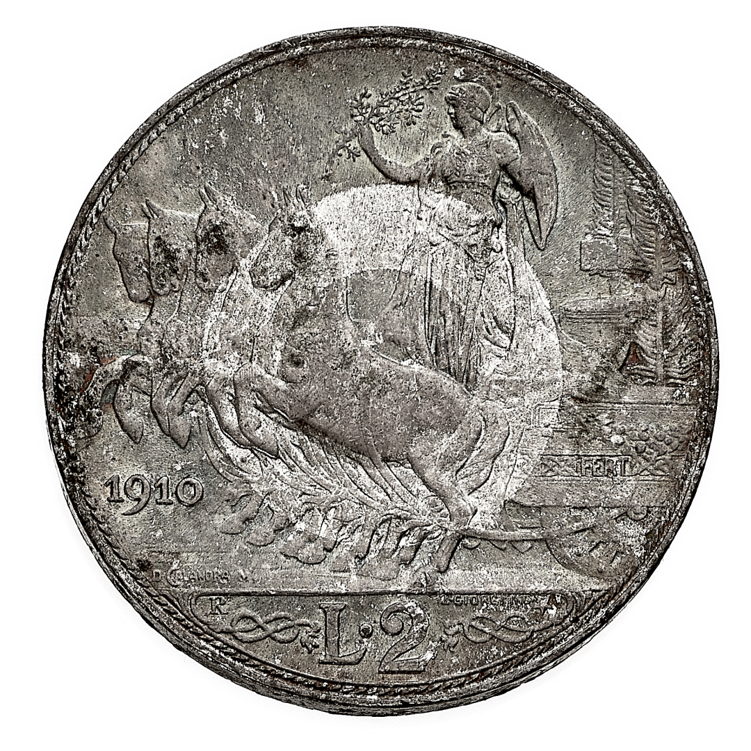 2 Lire Quadriga Veloce 1910 - Zecca: Roma - Diritto: effigie del Re a destra - Rovescio: l'Italia elmata con scudo e ramo d'ulivo su quadriga veloce a sinistra - gr. 10,00 - Patina iridescente, q.FDC