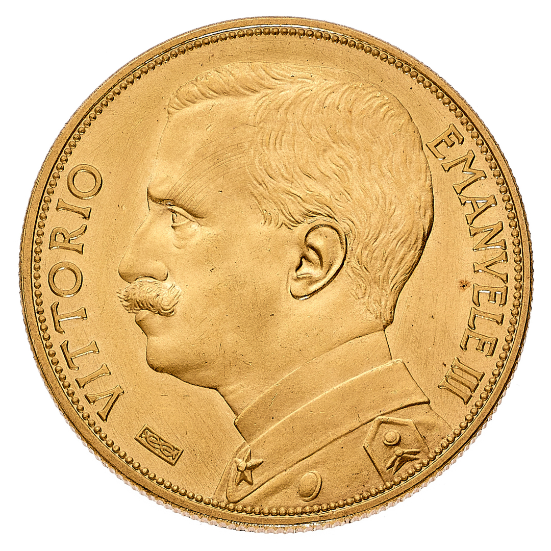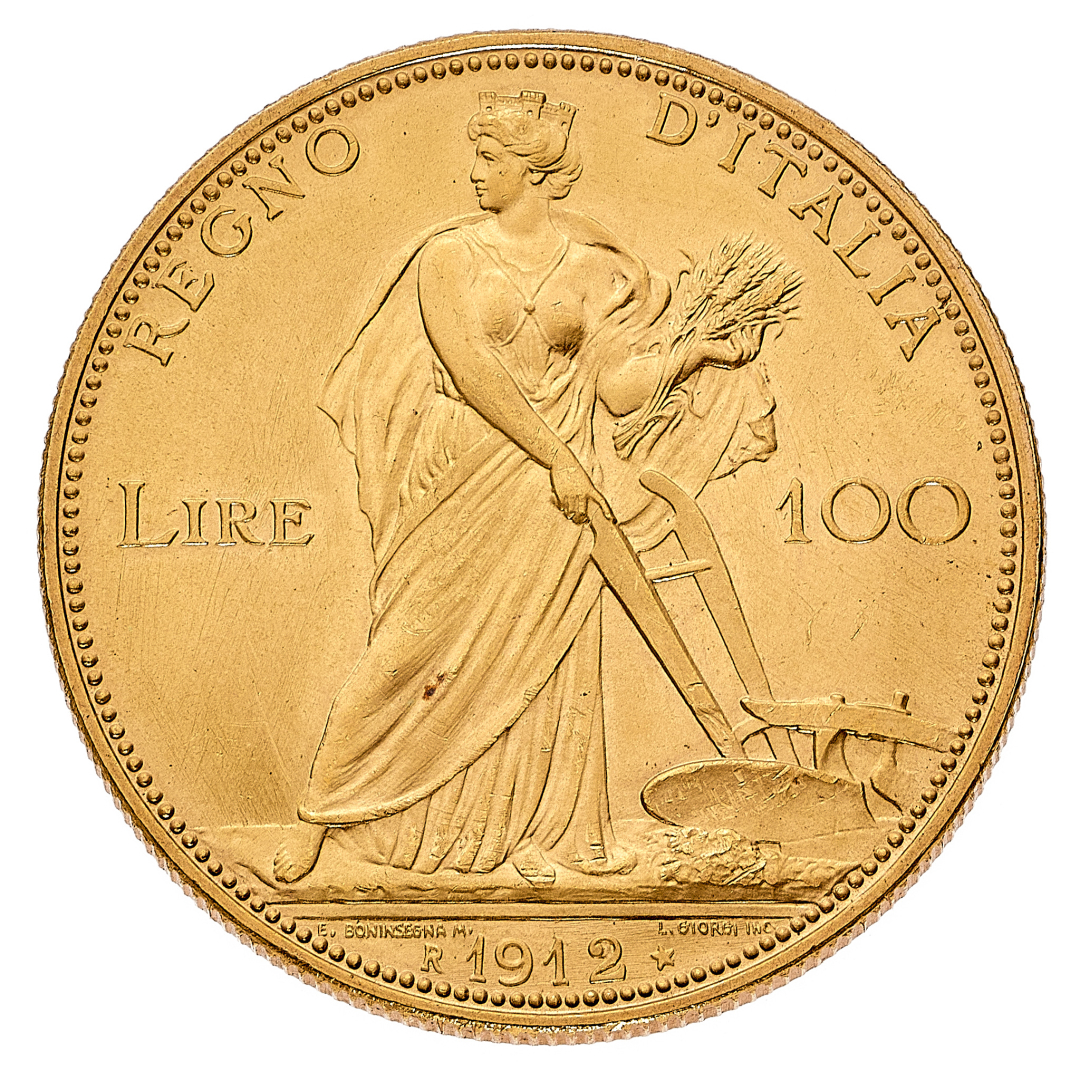 100 Lire Aratrice 1912 NGC MS 64+ - Zecca: Roma - Diritto: effigie del Re a sinistra - Rovescio: allegoria dell'Italia agricola con aratro e fascio di spighe - Rara - Cert. #8586306-008
