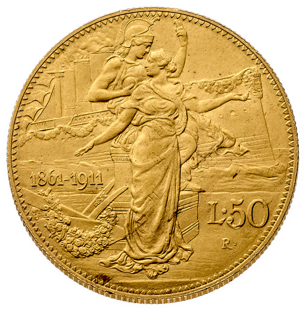 50 Lire Cinquantenario 1911 - Zecca: Roma - Diritto: effigie del Re a sinistra - Rovescio: allegoria dell'Italia e di Roma con una nave da guerra sullo sfondo - gr. 16,14 - q.FDC