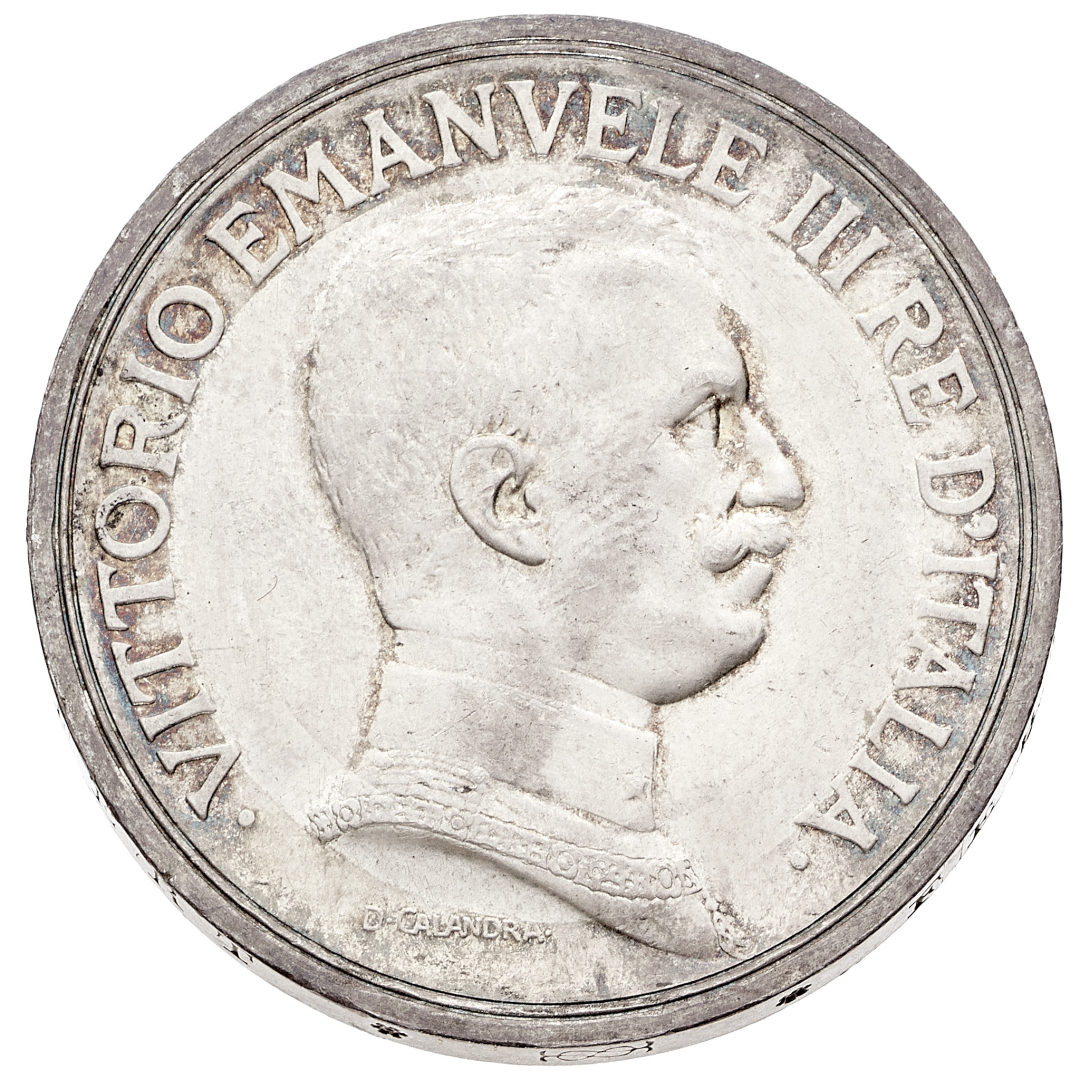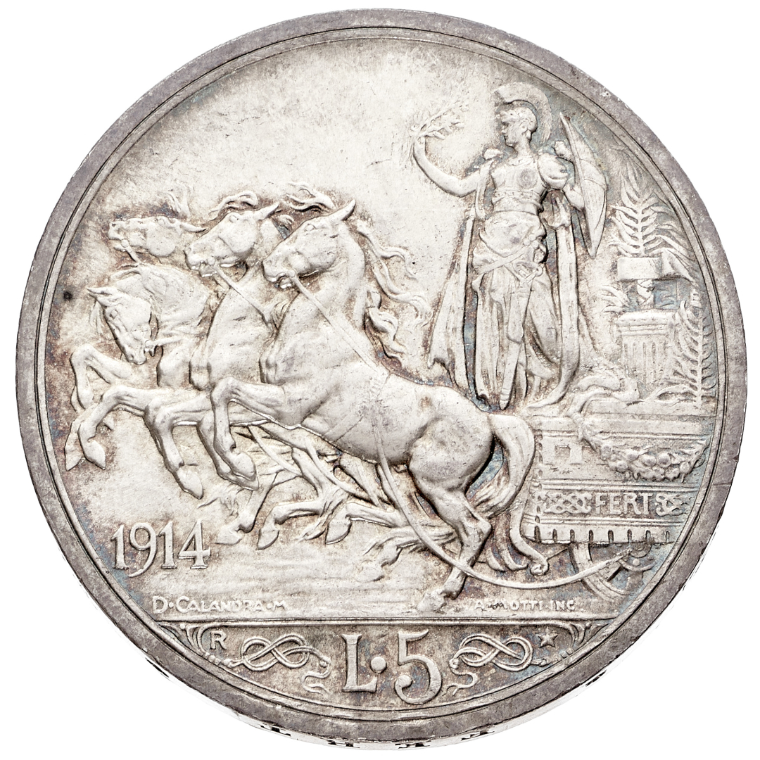 5 Lire Quadriga Briosa 1914 NGC MS 63 - Zecca: Roma - Diritto: effigie del Re a destra - Rovescio: l'Italia elmata con scudo e ramo d'ulivo su quadriga briosa a destra - Rara - Cert. #8586306-004