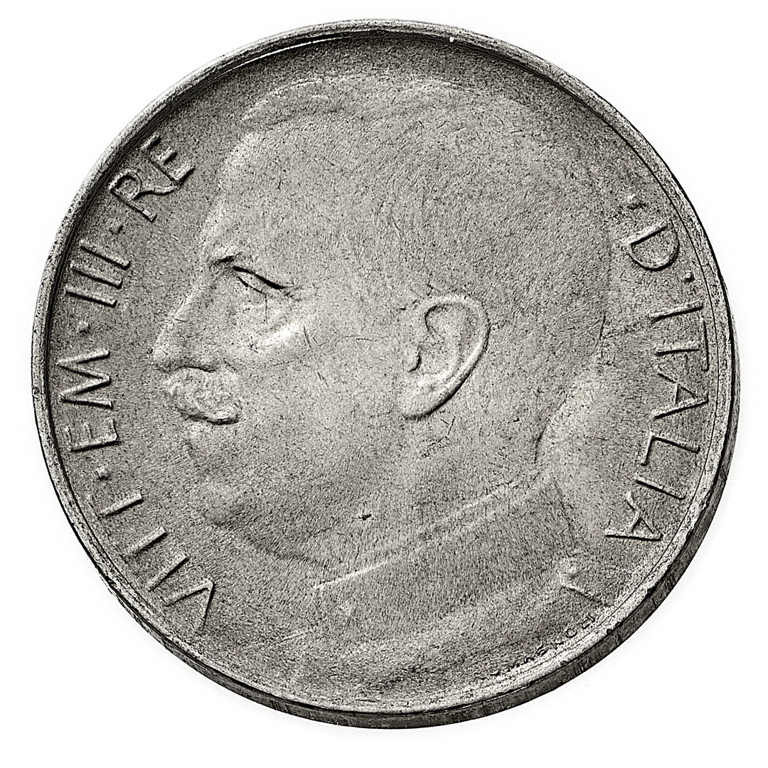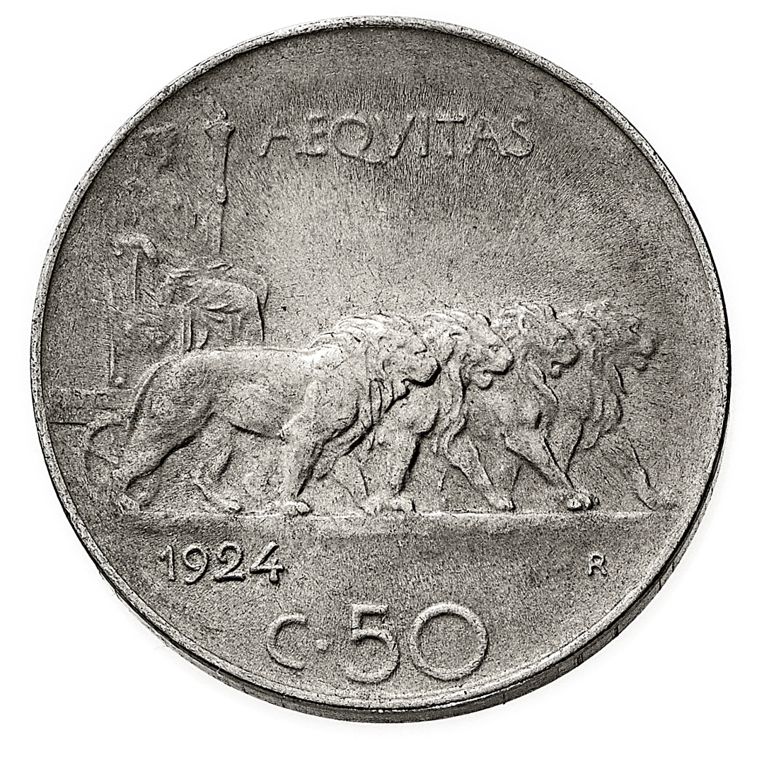 50 Centesimi Leoni 1924 contorno liscio - Zecca: Roma - Diritto: effigie del Re a sinistra - Rovescio: l'Italia seduta su quadriga di leoni al passo verso destra - gr. 5,99 - Rara - SPL