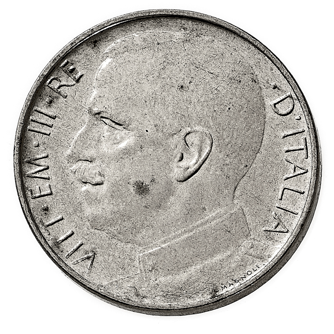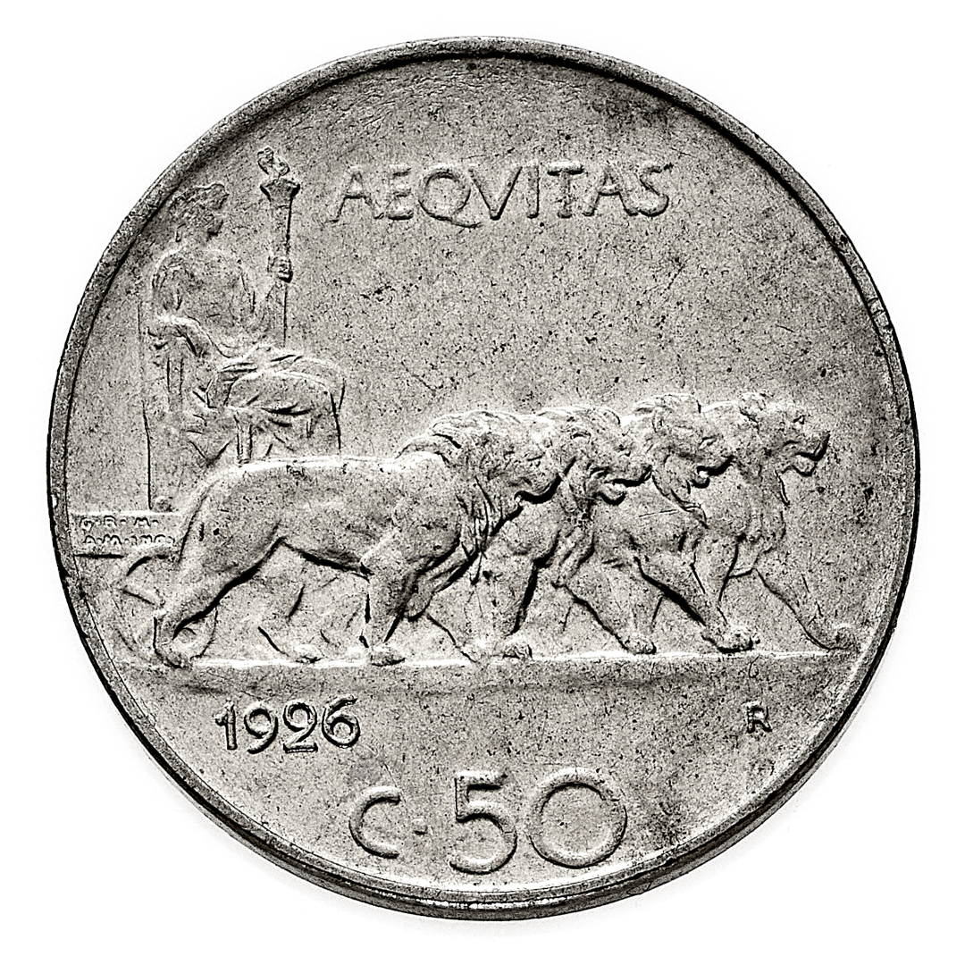 50 Centesimi Leoni 1926 contorno liscio - Zecca: Roma - Diritto: effigie del Re a sinistra - Rovescio: l'Italia seduta su quadriga d leoni al passo verso destra - gr. 6,10 - Rara, solo 500 esemplari coniati - SPL