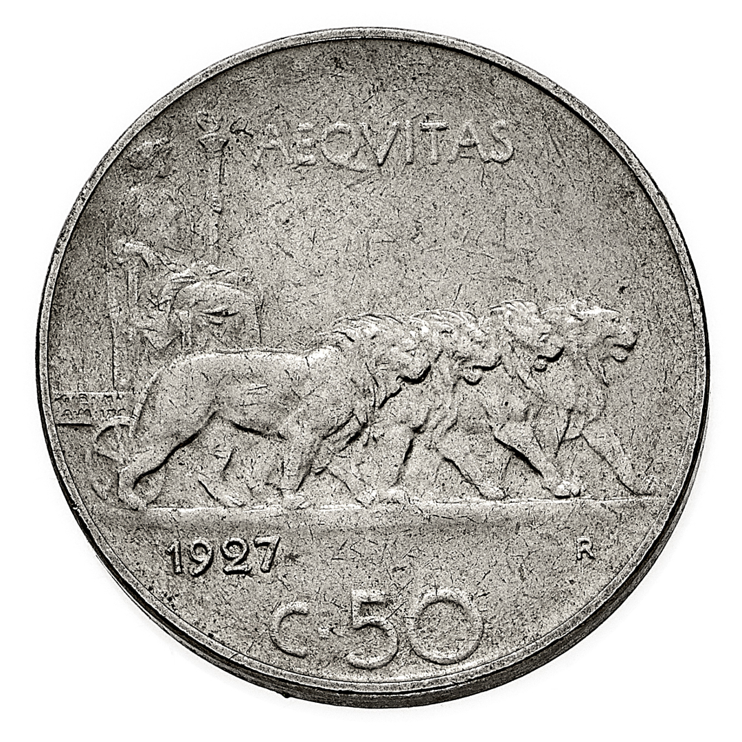 50 Centesimi Leoni 1927 contorno liscio - Zecca: Roma - Diritto: effigie del Re a sinistra - Rovescio: l'Italia seduta su quadriga di leoni al passo verso destra - gr. 5,95 - Rara, solo 100 esemplari coniati - SPL