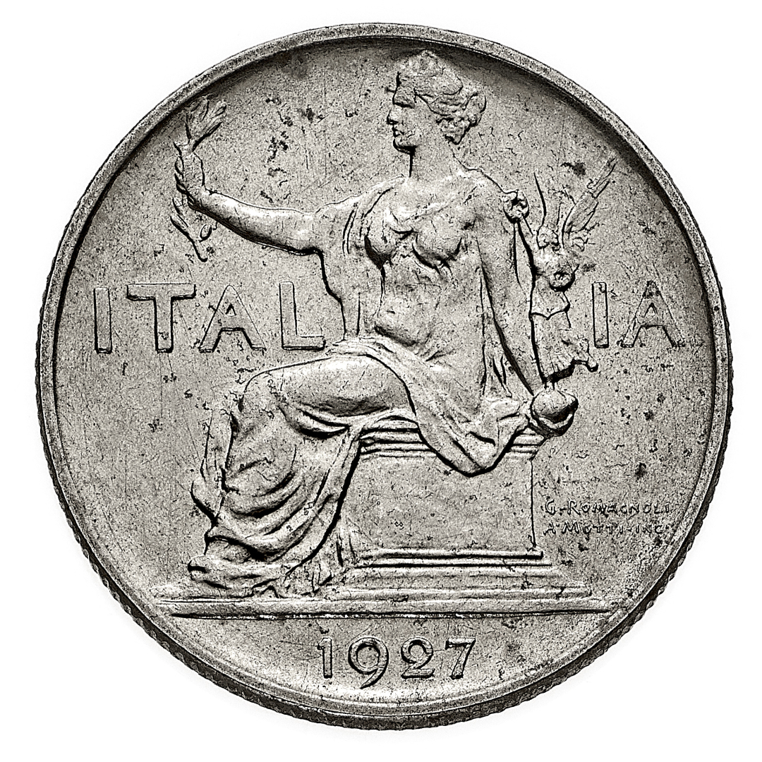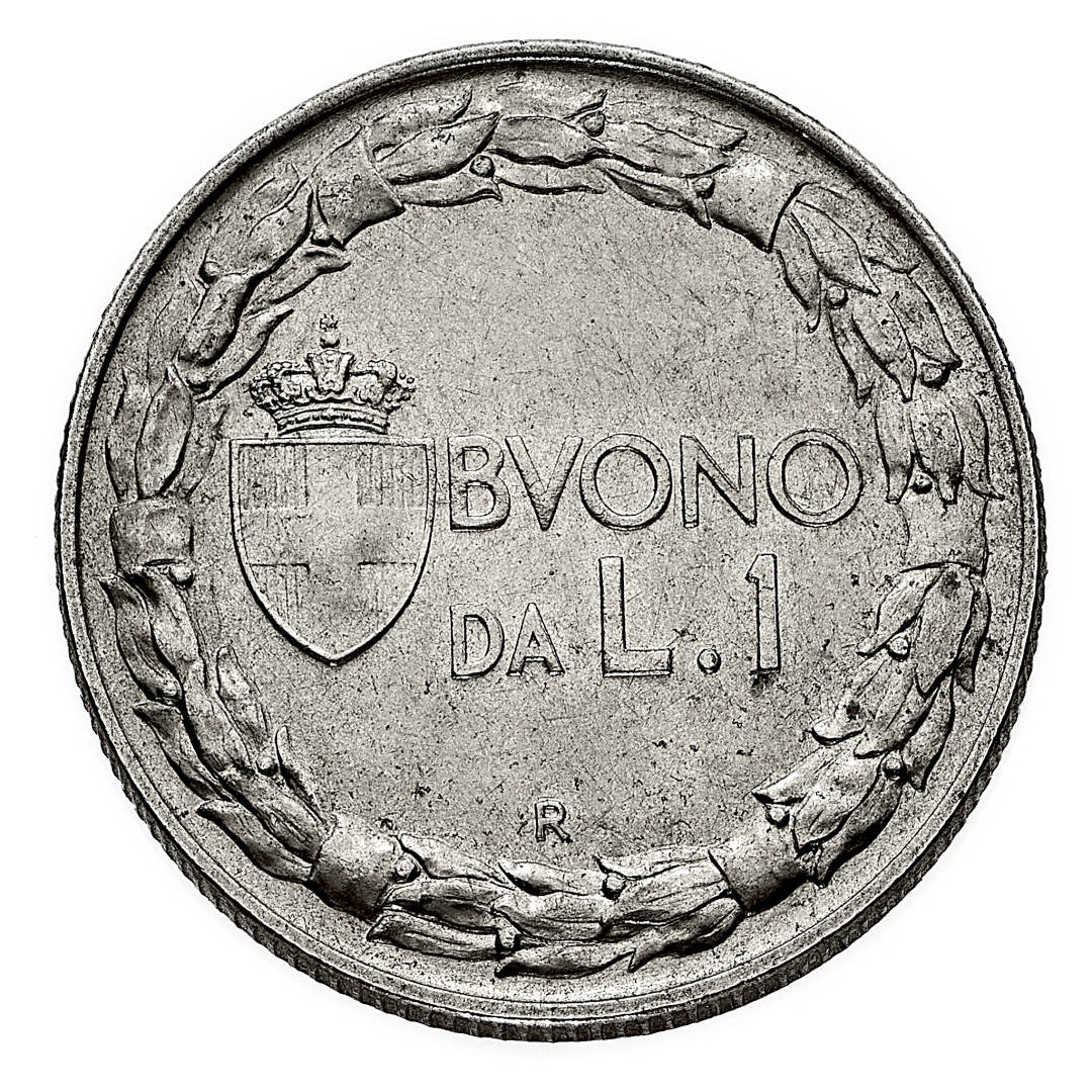 Buono da 1 Lira 1927 - Zecca: Roma - Diritto: l'Italia seduta a sinistra - Rovescio: valore entro corona di alloro - gr. 8,02 - Rara, solo 100 esemplari coniati - q.FDC