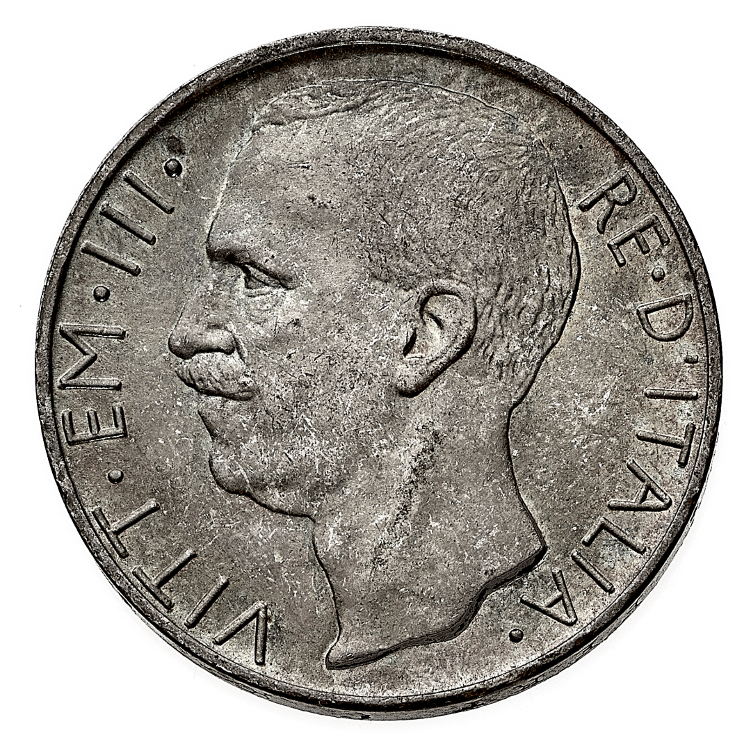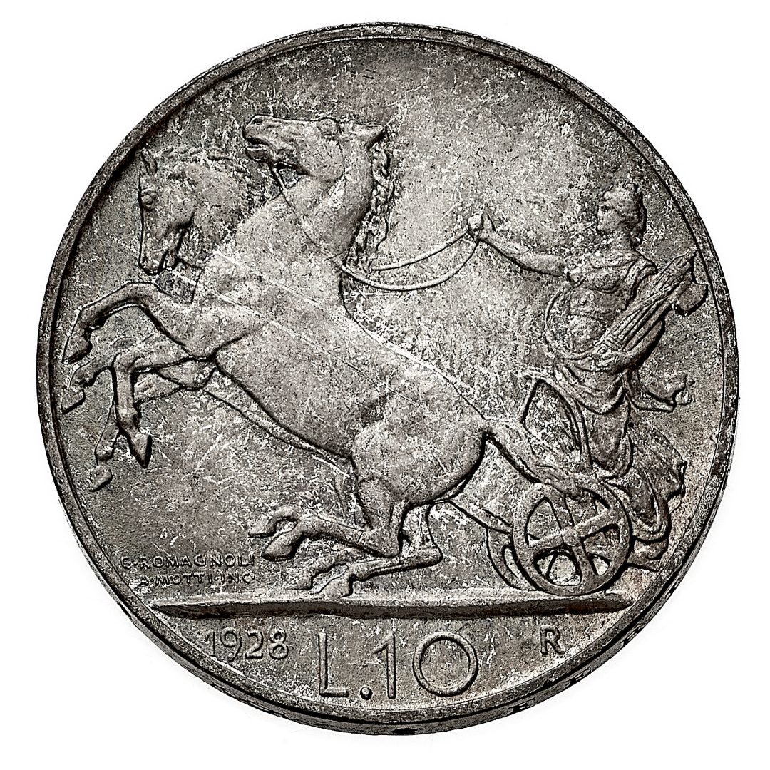 10 Lire Biga 1928 una rosetta - Zecca: Roma - Diritto: effigie del Re a sinistra - Rovescio: allegoria dell'Italia con fascio littorio su biga al galoppo verso sinistra - gr. 9,99 - Patina iridescente, praticamente FDC