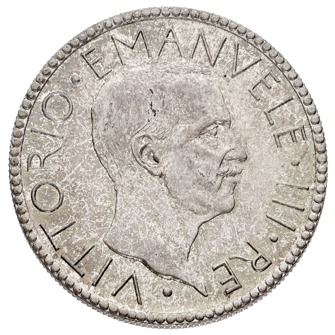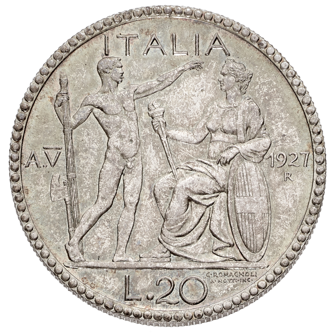 20 Lire Littore 1927 Anno V NGC MS 66 - Zecca: Roma - Diritto: effigie del Re a destra - Rovescio: littore con fascio nella mano destra saluta romanamente l'Italia seduta con fiaccola e scudo sabaudo - Di grande rarità - Coniata in soli 100 esemplari - Cert. #8586307-002