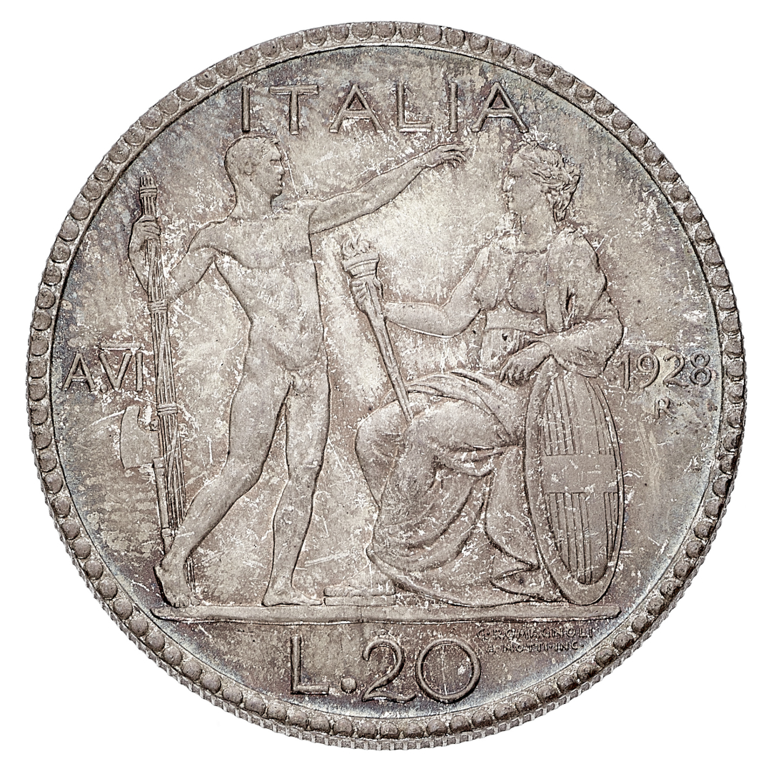 20 Lire Littore 1928 Anno VI NGC MS 66 - Zecca: Roma - Diritto: effigie del Re a destra - Rovescio: littore con fascio nella mano destra, saluta romanamente l'Italia seduta con fiaccola e scudo sabaudo - gr. 14,99 - Cert. #8586307-007