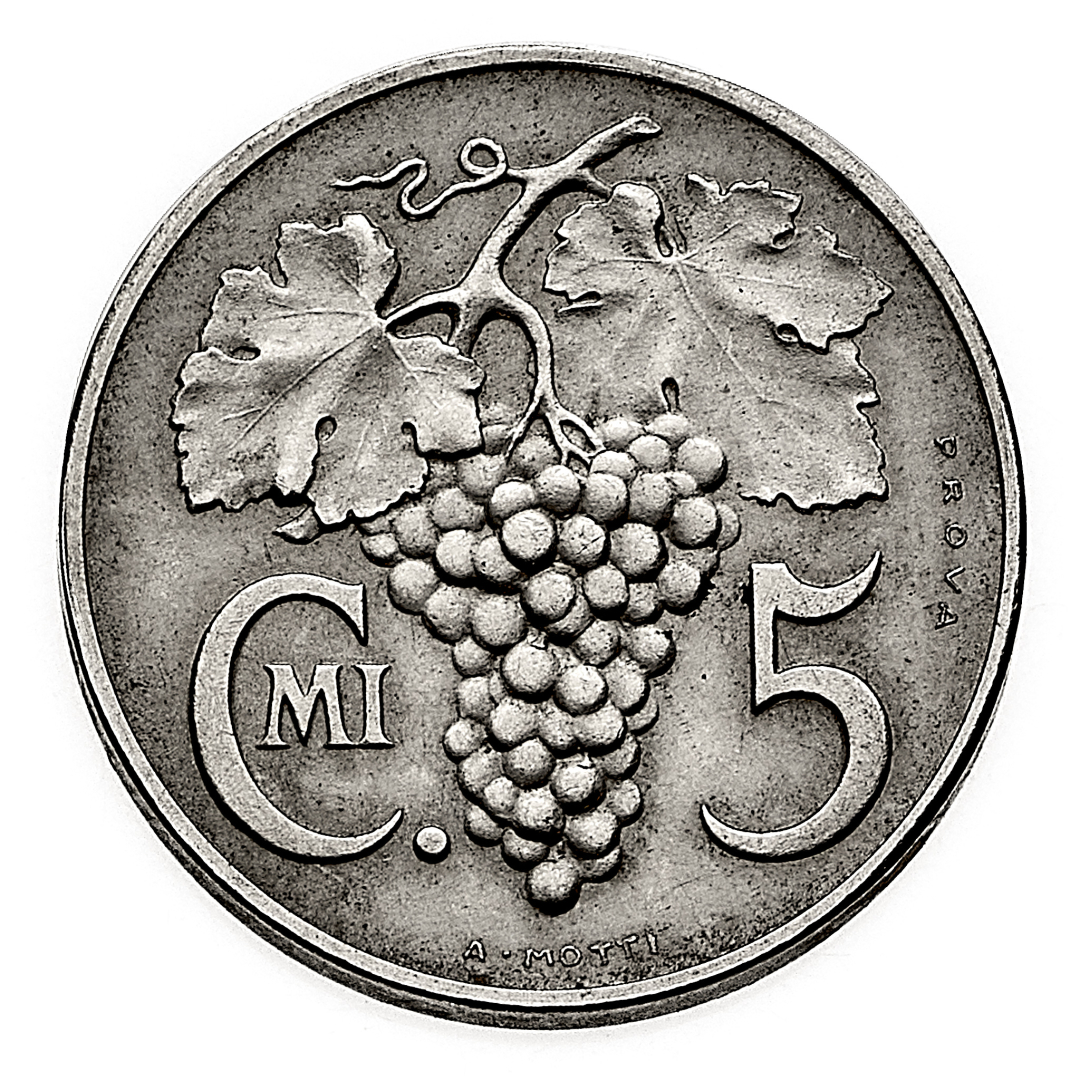 Progetto del 5 Centesimi 1916 - Zecca: Roma - Diritto: stemma di Casa Savoia coronato - Rovescio: grappolo d'uva; a destra la dicitura PROVA - gr. 2,31 - Rara - FDC