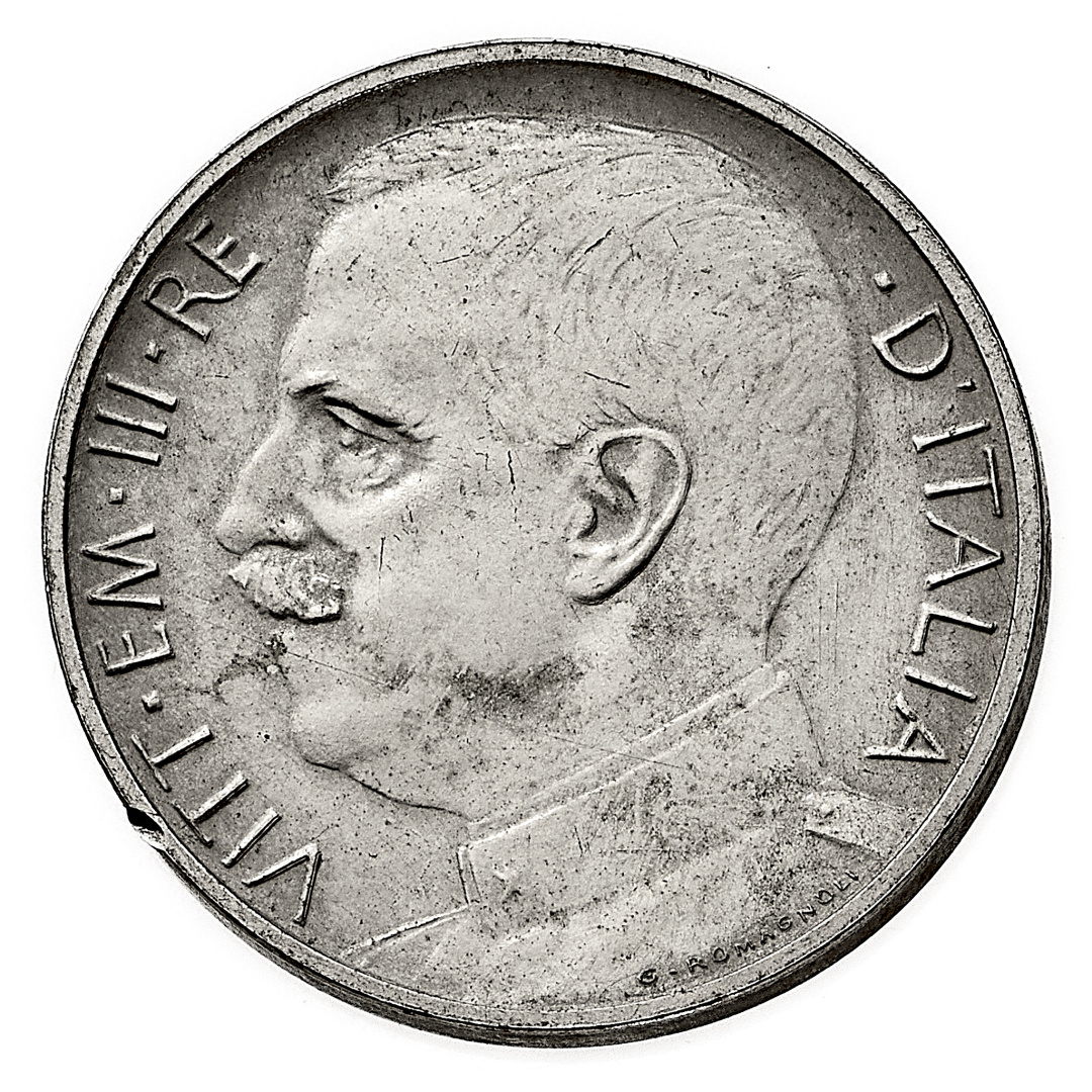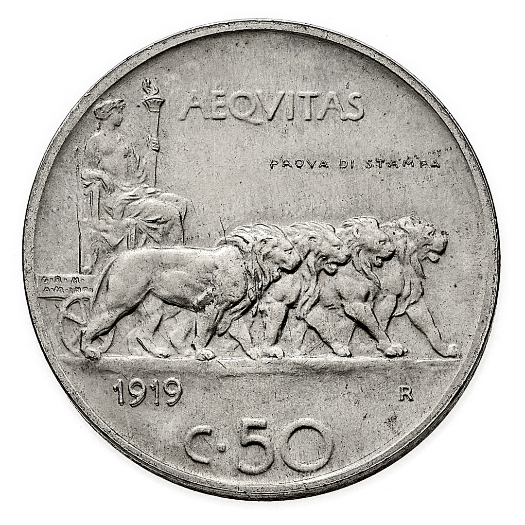 50 Centesimi Leoni 1919 Prova - Zecca: Roma - Diritto: effigie del Re a sinistra - Rovescio: l'Italia seduta a destra su quadriga di leoni al passo verso destra; nel campo, a destra, la dicitura PROVA - gr. 5,86 - Molto rara - FDC
