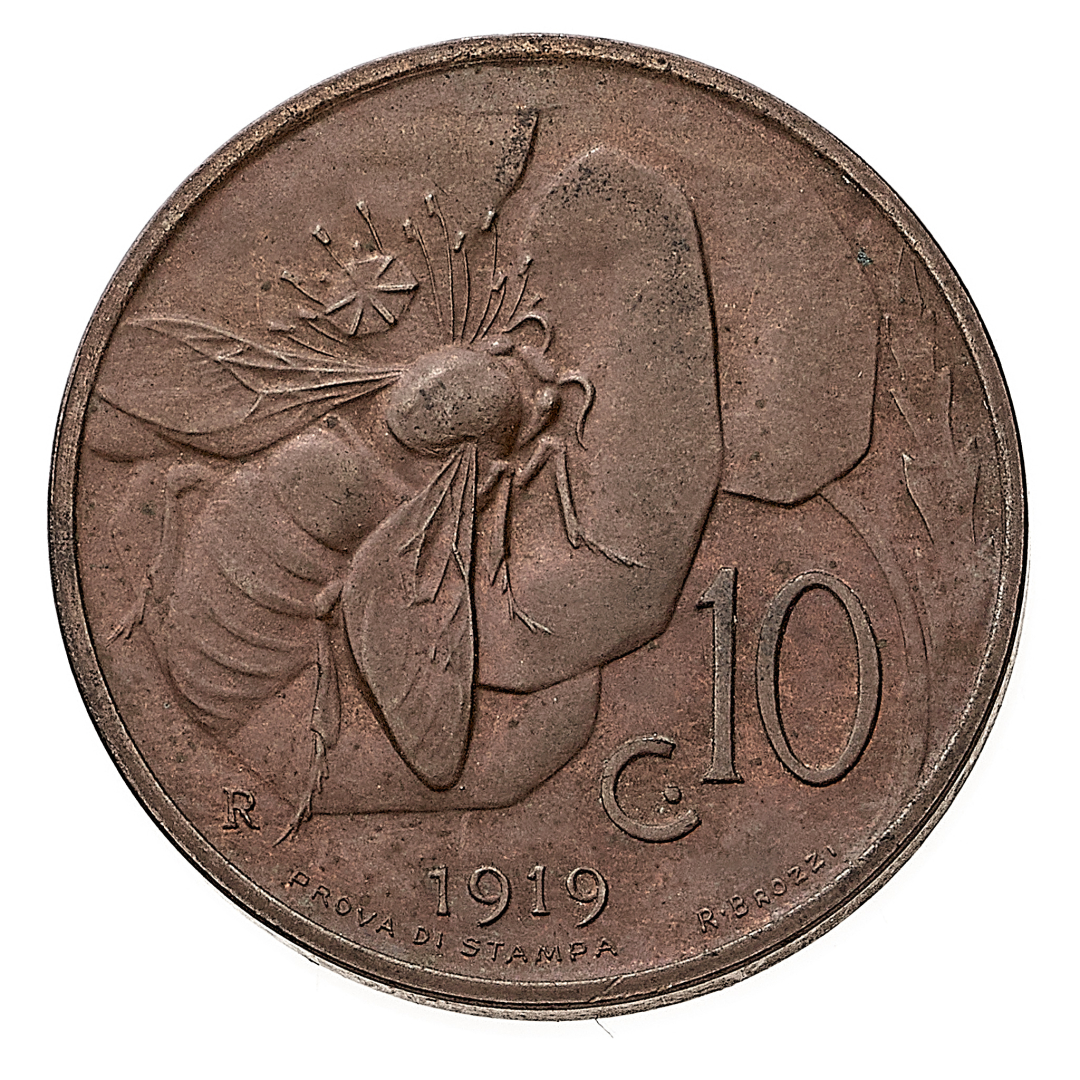 10 Centesimi Ape 1919 Prova di Stampa - Zecca: Roma - Diritto: effigie del Re a sinistra - Rovescio: ape su fiore; in basso, nel campo, la dicitura PROVA DI STAMPA - gr. 5,48 - Rara - Migliore di SPL