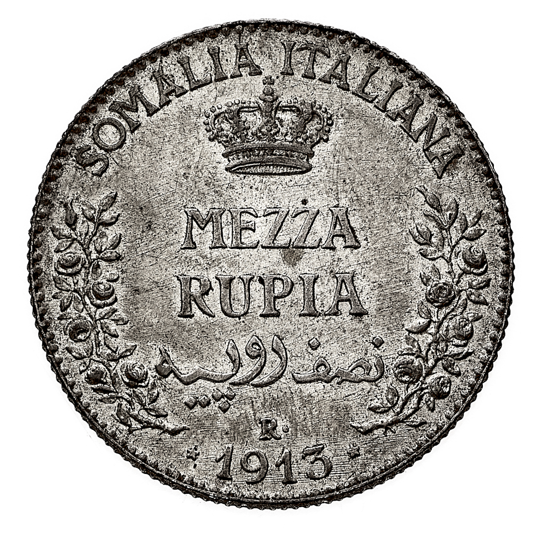 Colonie - Somalia - Mezza Rupia 1913 - Zecca: Roma - Diritto: effigie del Re a destra - Rovescio: corona e valore bilingue entro due rami di rose - gr. 5,81 - q.FDC