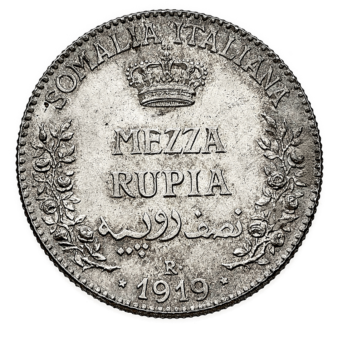 Colonie - Somalia - Mezza Rupia 1919 - Zecca: Roma - Diritto: effigie del Re a destra - Rovescio: corona e valore bilingue entro due rami di rose - gr. 5,85 - Patina iridescente, q.FDC