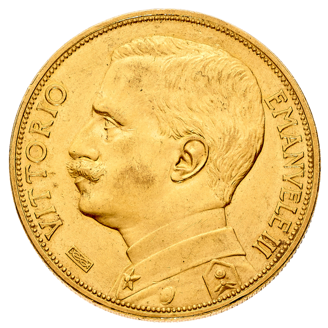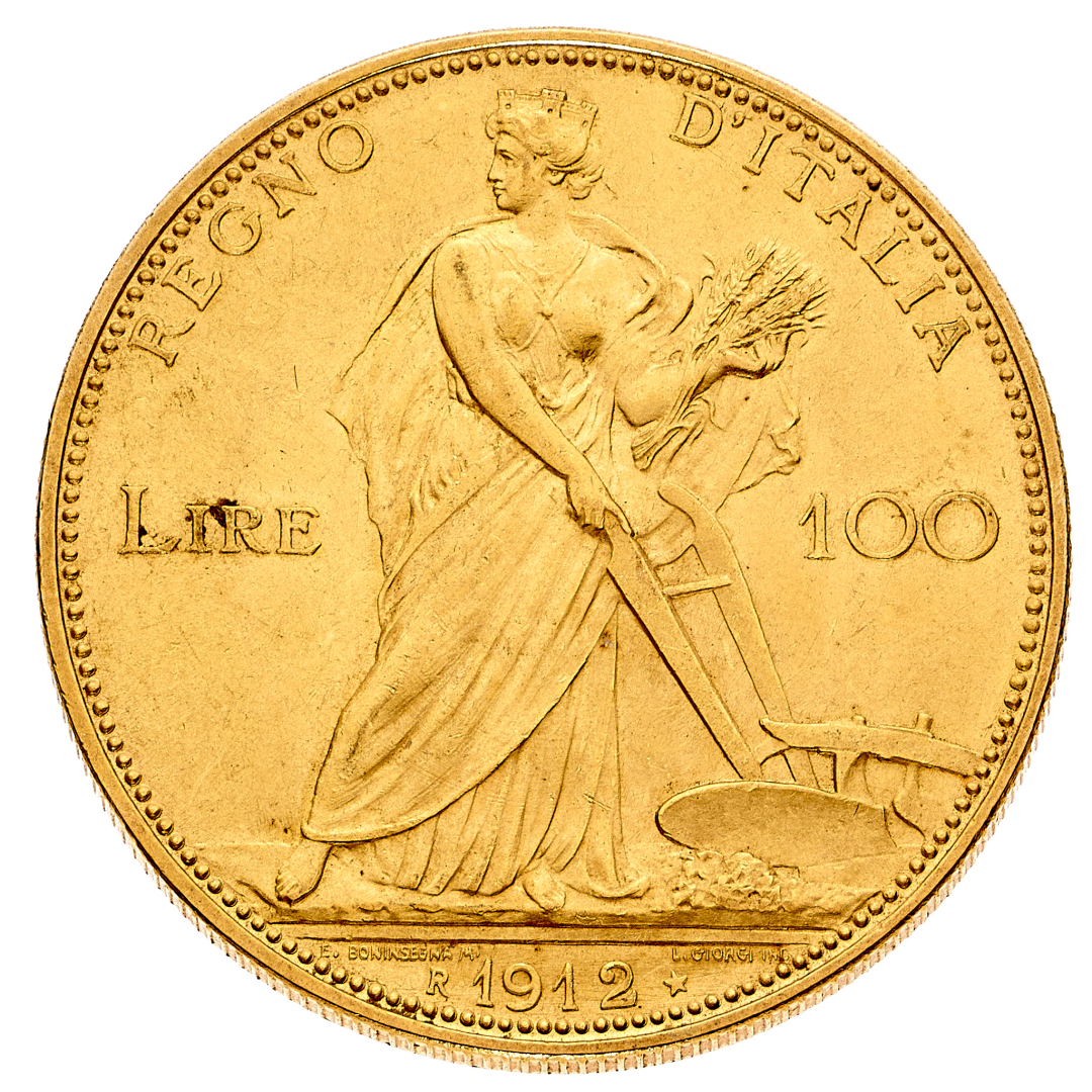 100 Lire Aratrice 1912 - Zecca: Roma - Diritto: effigie del Re a sinistra - Rovescio: allegoria dell'Italia agricola con aratro e fascio di spighe - gr. 32,25 - Rara - Lievi segni di contatto, q.FDC