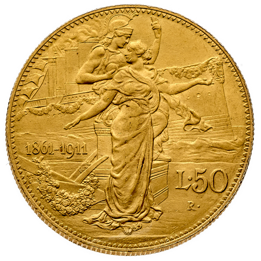 50 Lire Cinquantenario 1911 - Zecca: Roma - Diritto: effigie del Re a sinistra - Rovescio: allegoria dell'Italia e di Roma con una nave da guerra sullo sfondo - gr. 16,14 - q.FDC