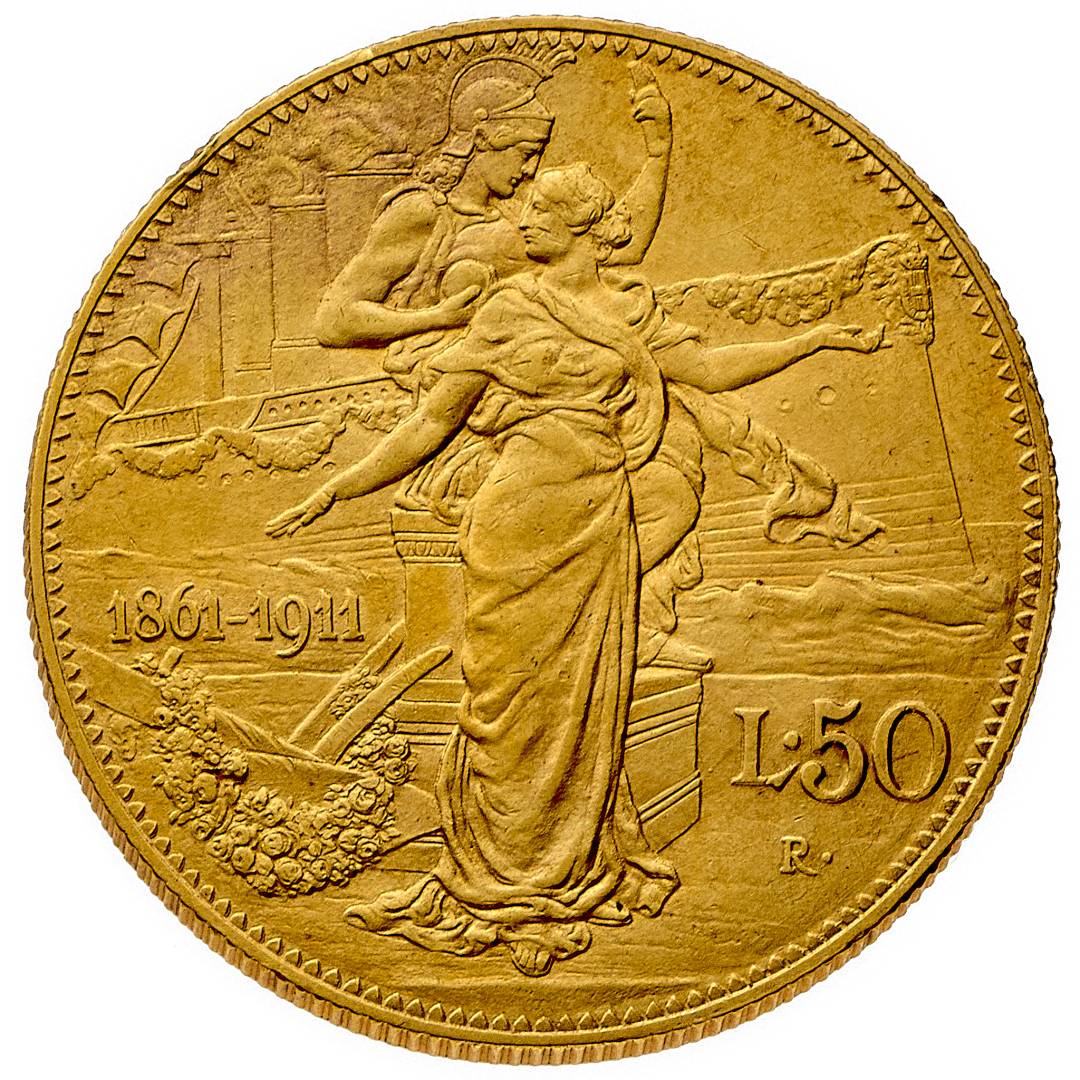 50 Lire Cinquantenario 1911 - Zecca: Roma - Diritto: effigie del Re a sinistra - Rovescio: allegoria dell'Italia con una nave da guerra sullo sfondo - gr. 16,11 - Migliore di SPL