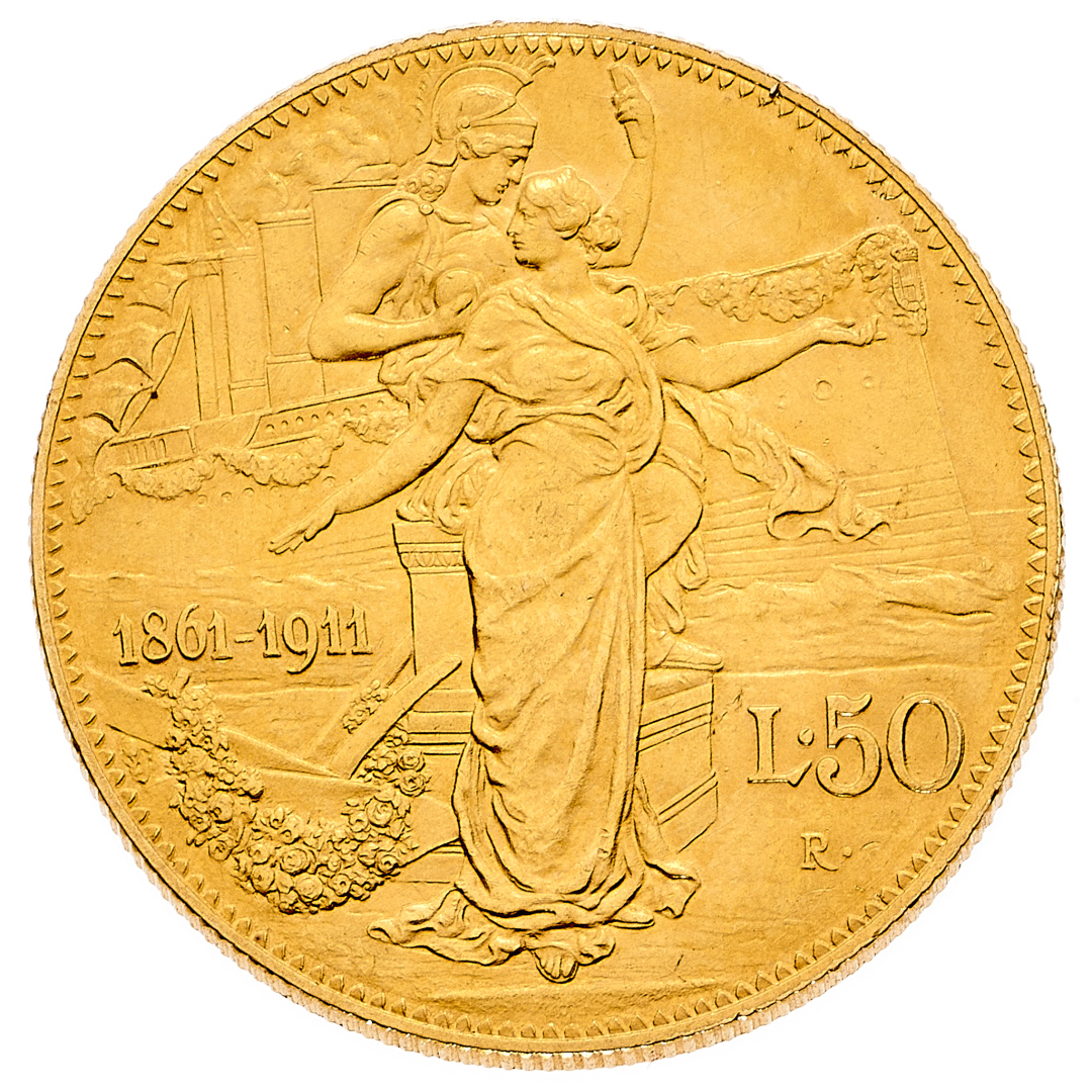 50 Lire Cinquantenario 1911 - Zecca: Roma - Diritto: effigie del Re a sinistra - Rovescio: allegoria dell'Italia e di Roma con una nave da guerra sullo sfondo - gr. 16,14 - Migliore di SPL