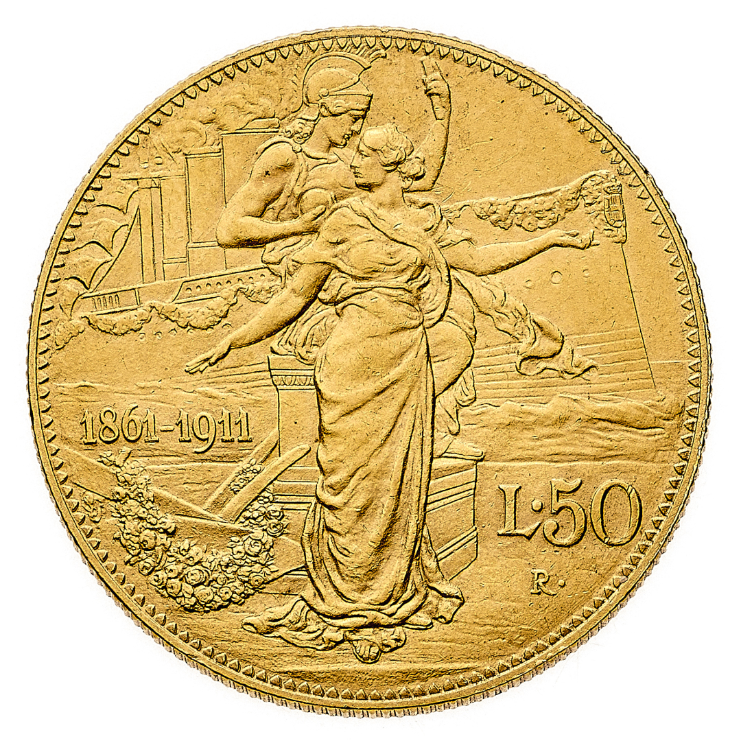 50 Lire Cinquantenario 1911 - Zecca: Roma - Diritto: effigie del Re a sinistra - Rovescio: allegoria dell'Italia e di Roma con una nave da guerra sullo sfondo - gr. 16,14 - Migliore di SPL