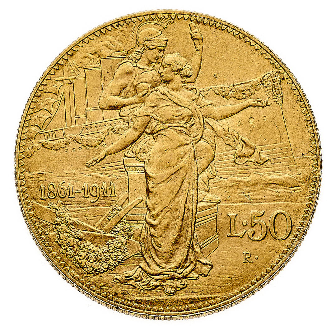 50 Lire Cinquantenario 1911 - Zecca: Roma - Diritto: effigie del Re a sinistra - Rovescio: allegoria dell'Italia e di Roma con una nave da guerra sullo sfondo - gr. 16,12 - Migliore di SPL
