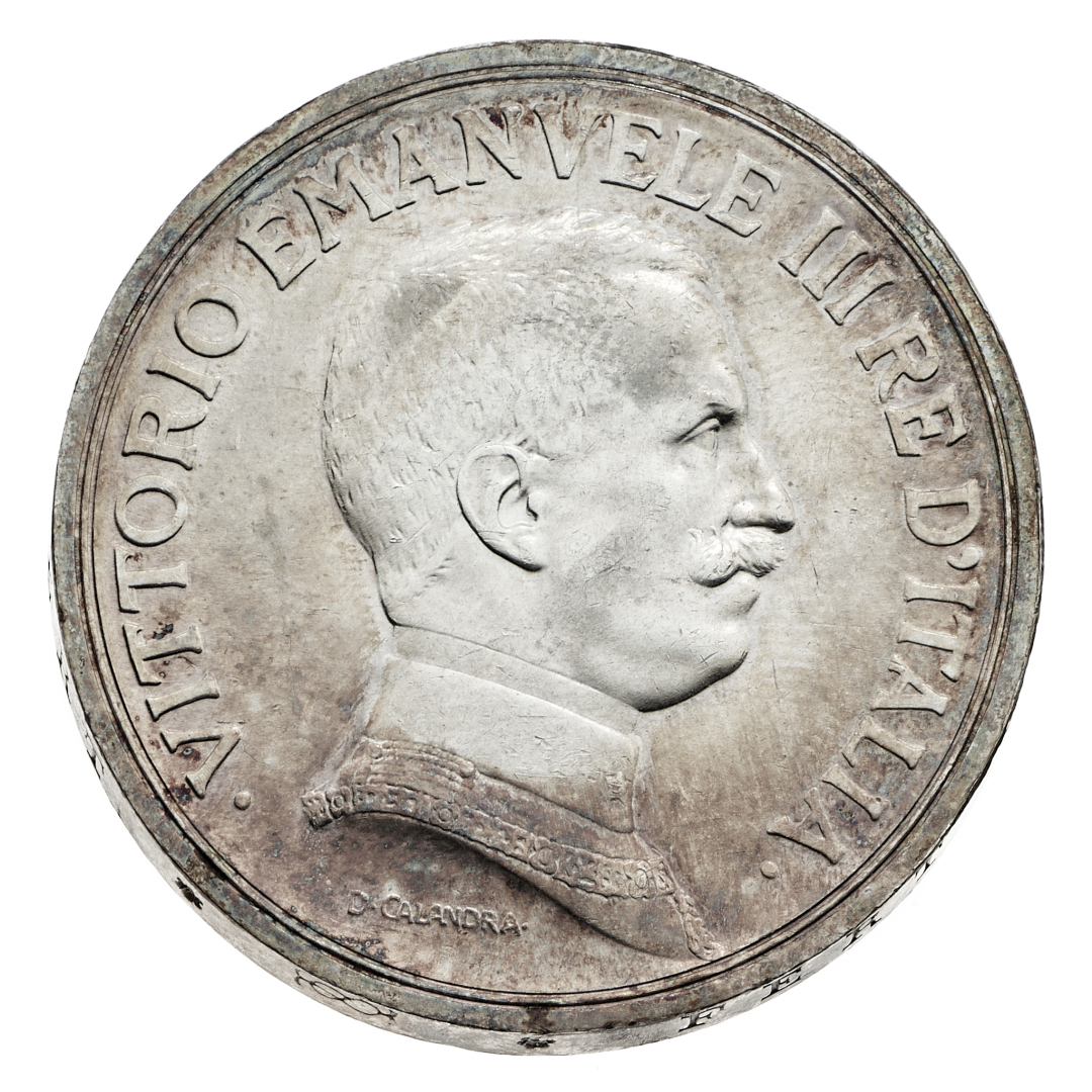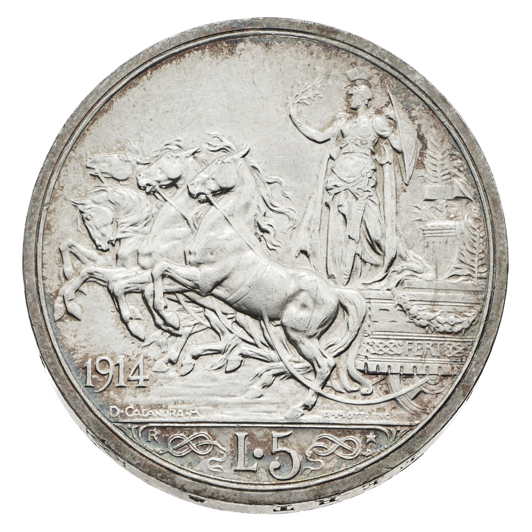 5 Lire Quadriga Briosa 1914 NGC MS 62 - Zecca: Roma - Diritto: effigie del Re a destra - Rovescio: l'Italia elmata con scudo e ramo d'ulivo su quadriga briosa a destra - gr. 25,07 - Rara - Cert. #8362406-001
