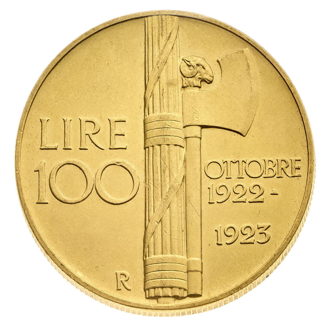 100 Lire Fascio 1923 - Zecca: Roma - Diritto: effigie del Re a sinistra - Rovescio: fascio littorio con scure a destra - Sigillata ("FDC")