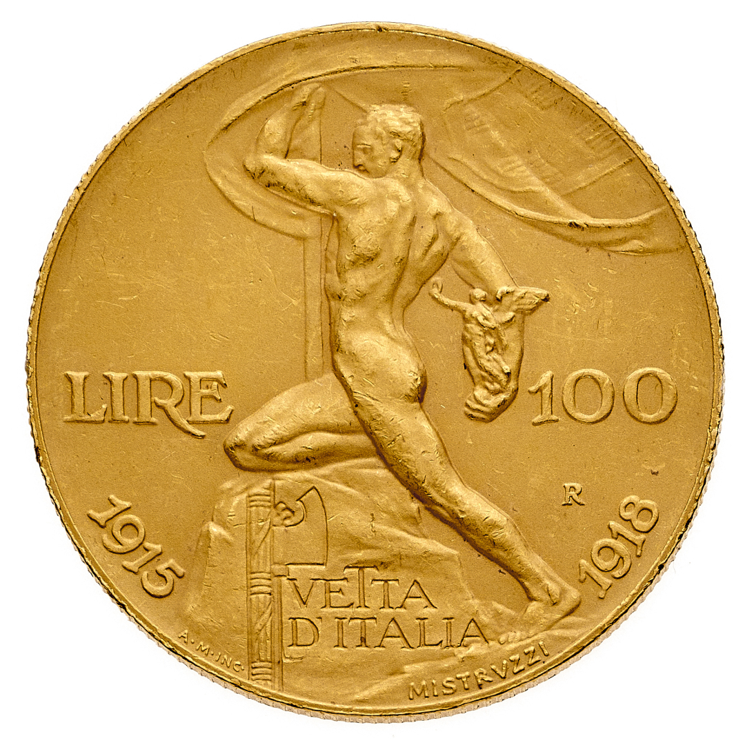 100 Lire Vetta d'Italia 1925 - Zecca: Roma - Diritto: effigie del Re a sinistra - Rovescio: figura maschile nuda con bandiera sabauda nella mano sinistra e Vittoria alata nella destra - gr. 32,25 - Rara - SPL