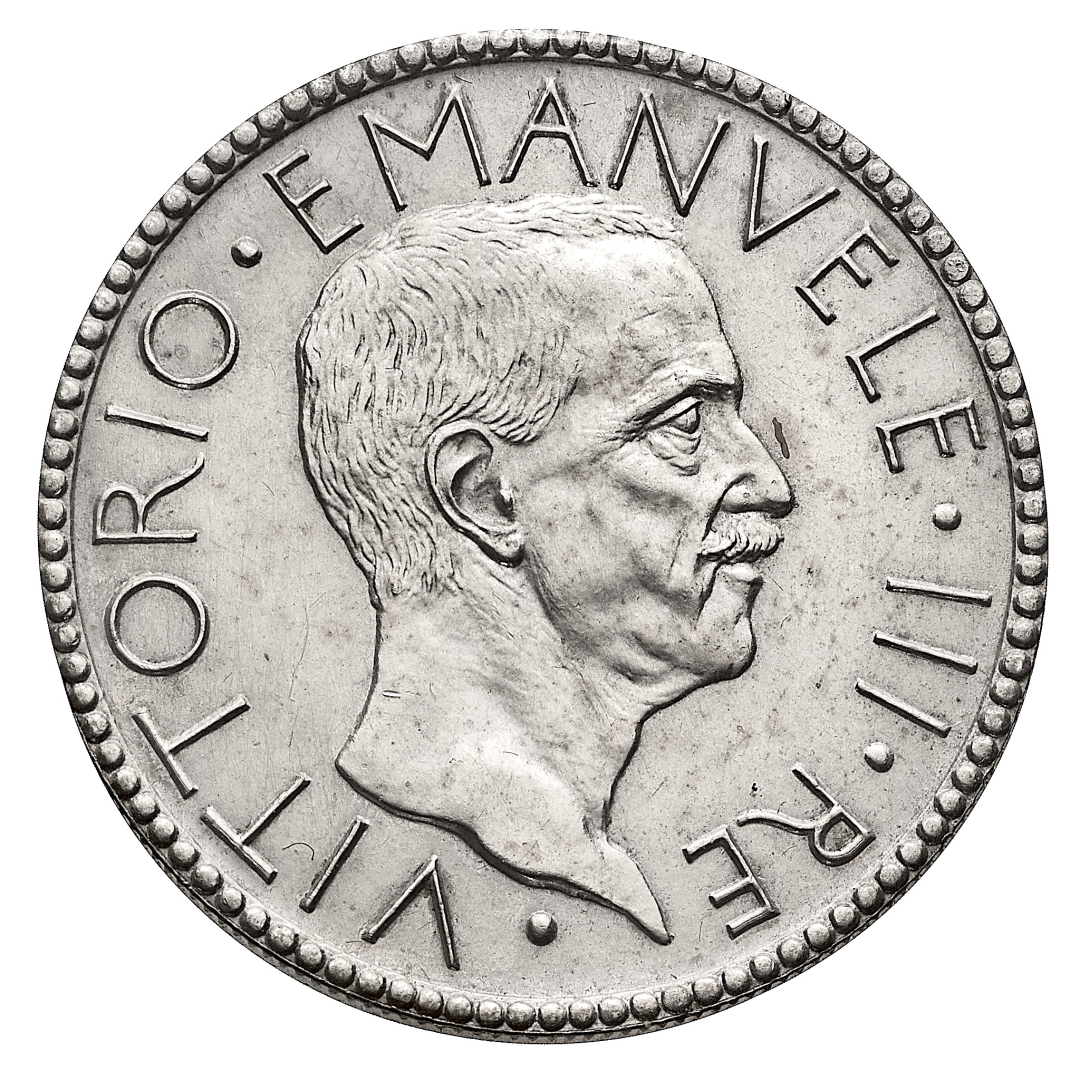 20 Lire Littore 1927 Anno V - Zecca: Roma - Diritto: effigie del Re a destra - Rovescio: littore con fascio nella mano destra saluta romanamente l'Italia seduta con fiaccola e scudo sabaudo - Molto rara, coniata in soli 100 esemplari - Sigillata "FDC64" - Ex collezione Avv. Bruno Segre