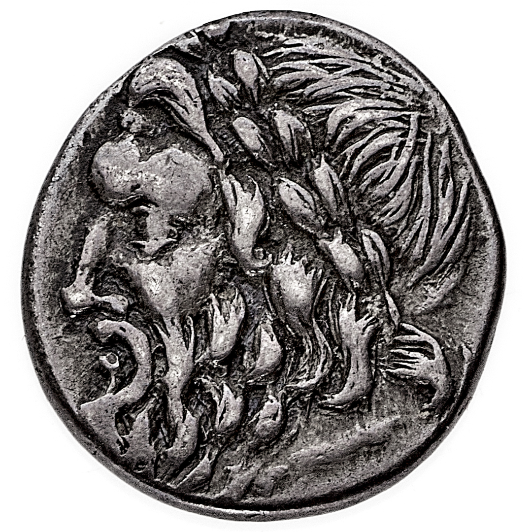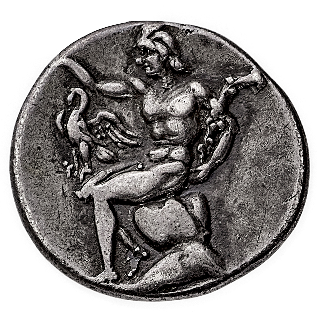 Megalopoli - Tribolo databile al periodo 175-168 a.C. - Diritto: testa laureata di Zeus a sinistra - Rovescio: Pan nudo seduto a sinistra su una roccia con un'aquila sulle ginocchia, solleva il braccio destro e tiene un lagobolon con la mano sinistra - gr. 2,43 - Patina di medagliere, BB - Proveniente dall'asta Fritz Rudolf Künker 262, Osnabrück 13.3.2015, n. 7156