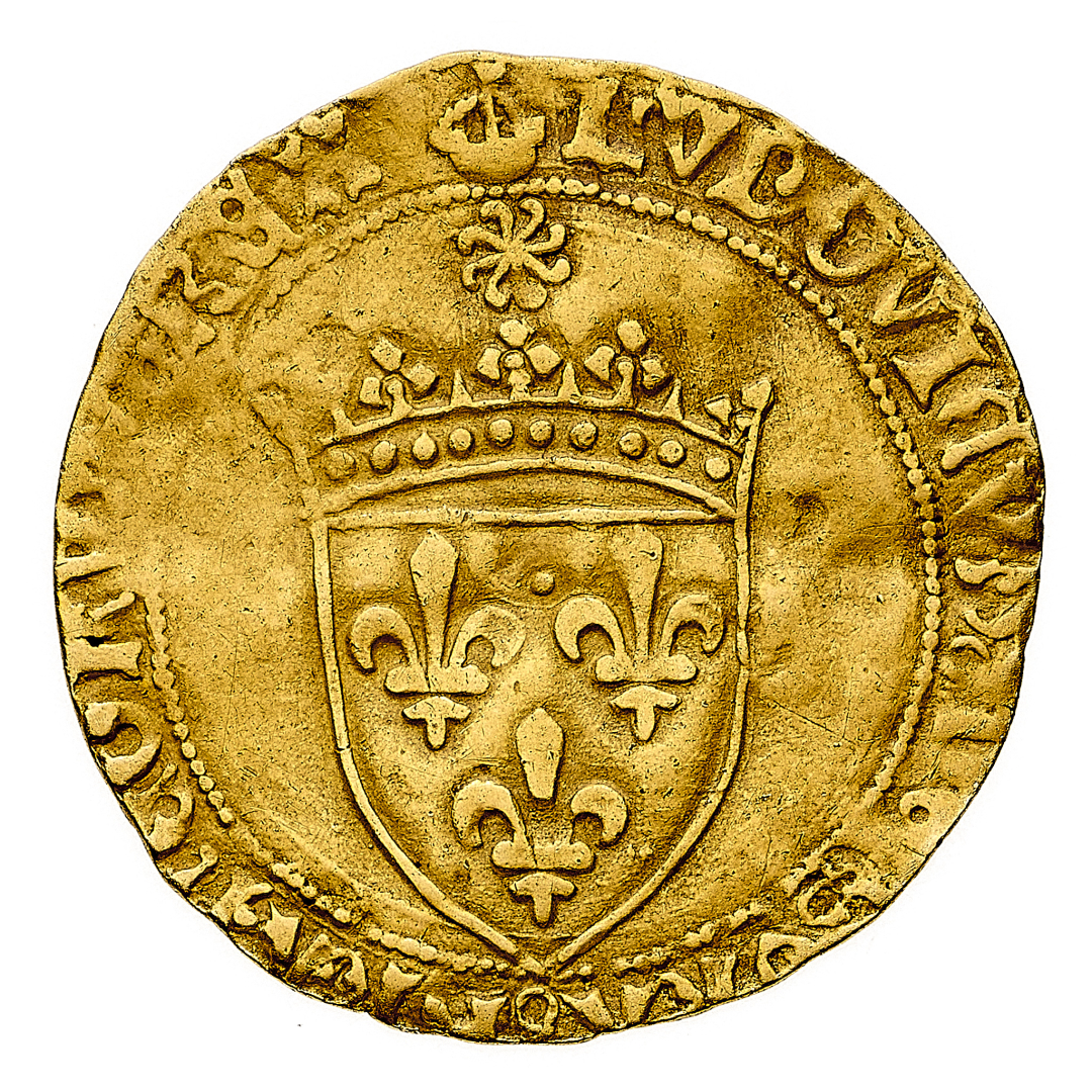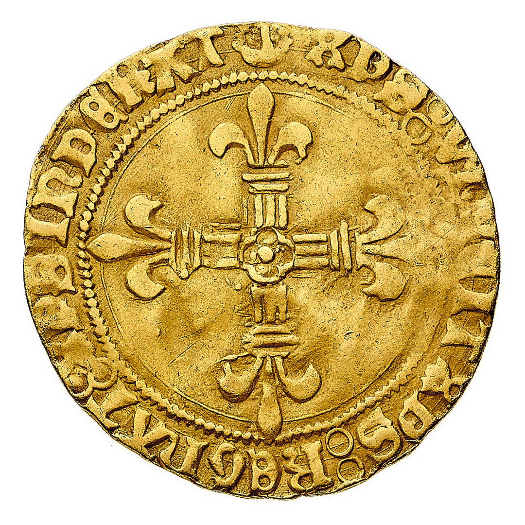 Louis XI (1461-1483) - Ecu d'or "au soleil" - Zecca: Bordeaux - Diritto: stemma di Francia coronato e sormontato da un piccolo sole - Rovescio: croce fiorata - gr. 3,41 - Rara - BB