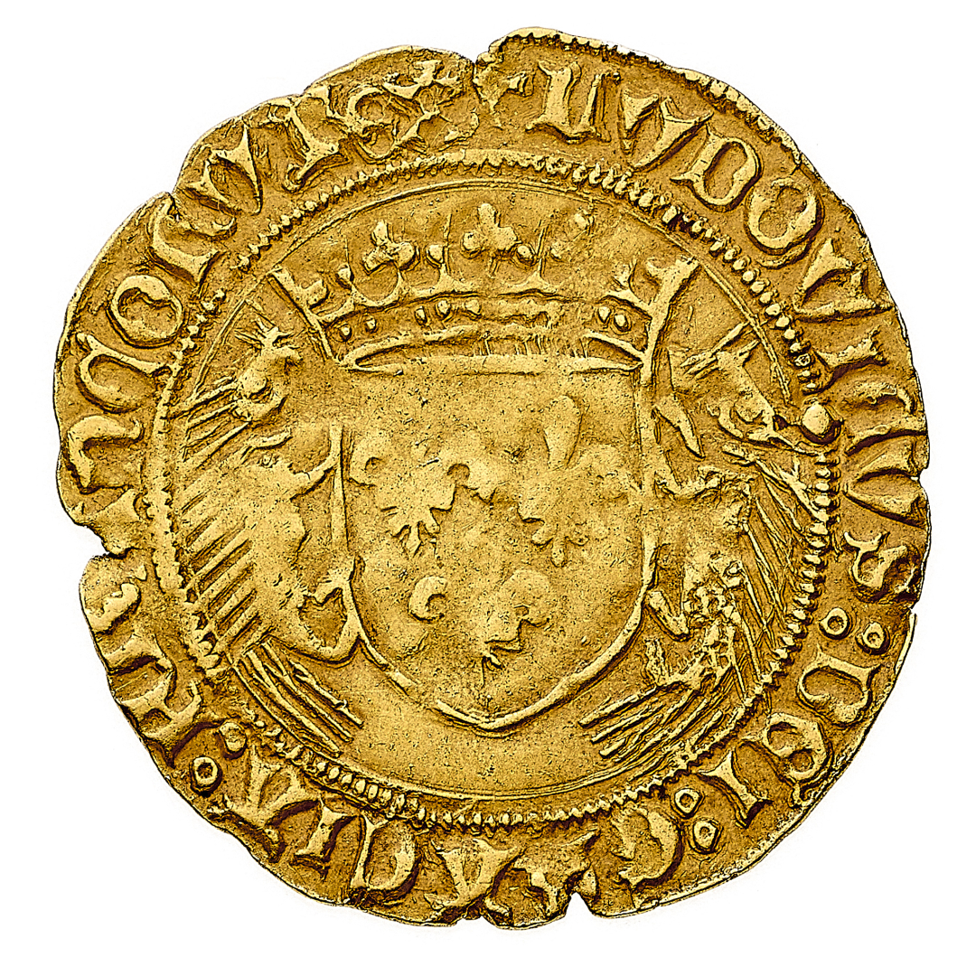 Louis XII (1498-1515) - Ecu d'or "au porc-èpic" - Zecca: Angers - Diritto: stemma di Francia coronato, con ai lati due porcospini - Rovescio: croce fiorata, ccantonata da due L e due porcospini - gr. 3,41 - Rara - Lievi fratture del tondello, BB
