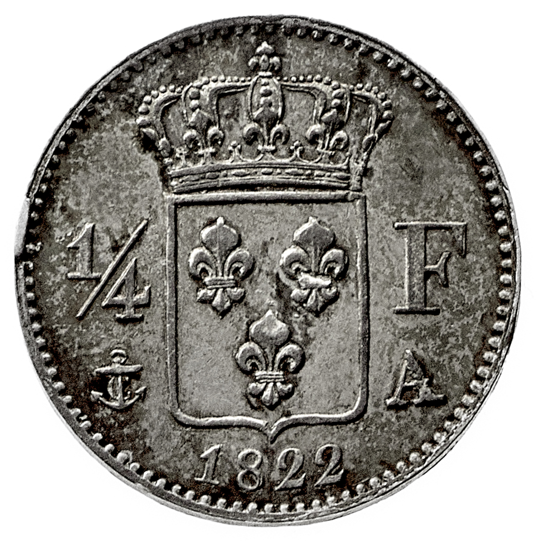 Louis XVIII (1814-1824) - 1/4 Franc 1822 - Zecca: Parigi - Diritto: effigie del Re a sinistra - Rovescio: stemma coronato entro due rami di alloro - gr. 1,30 - Piacevole patina di medagliere, migliore di SPL