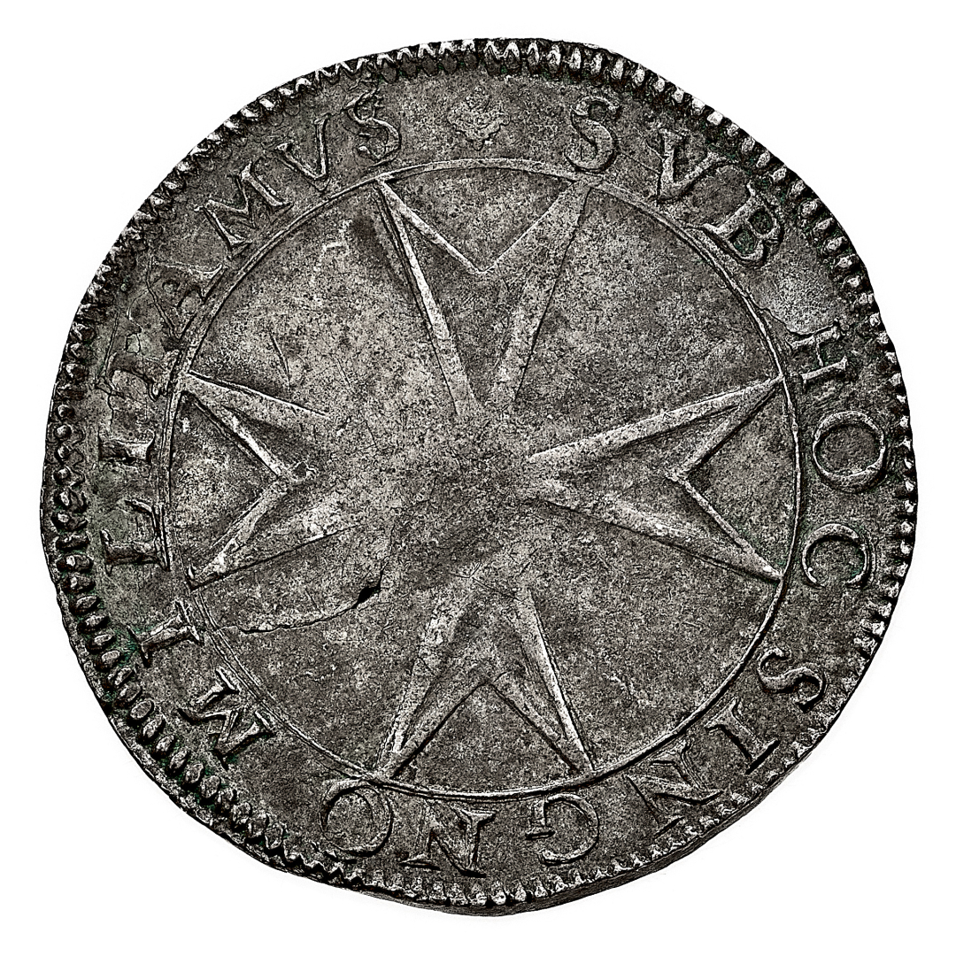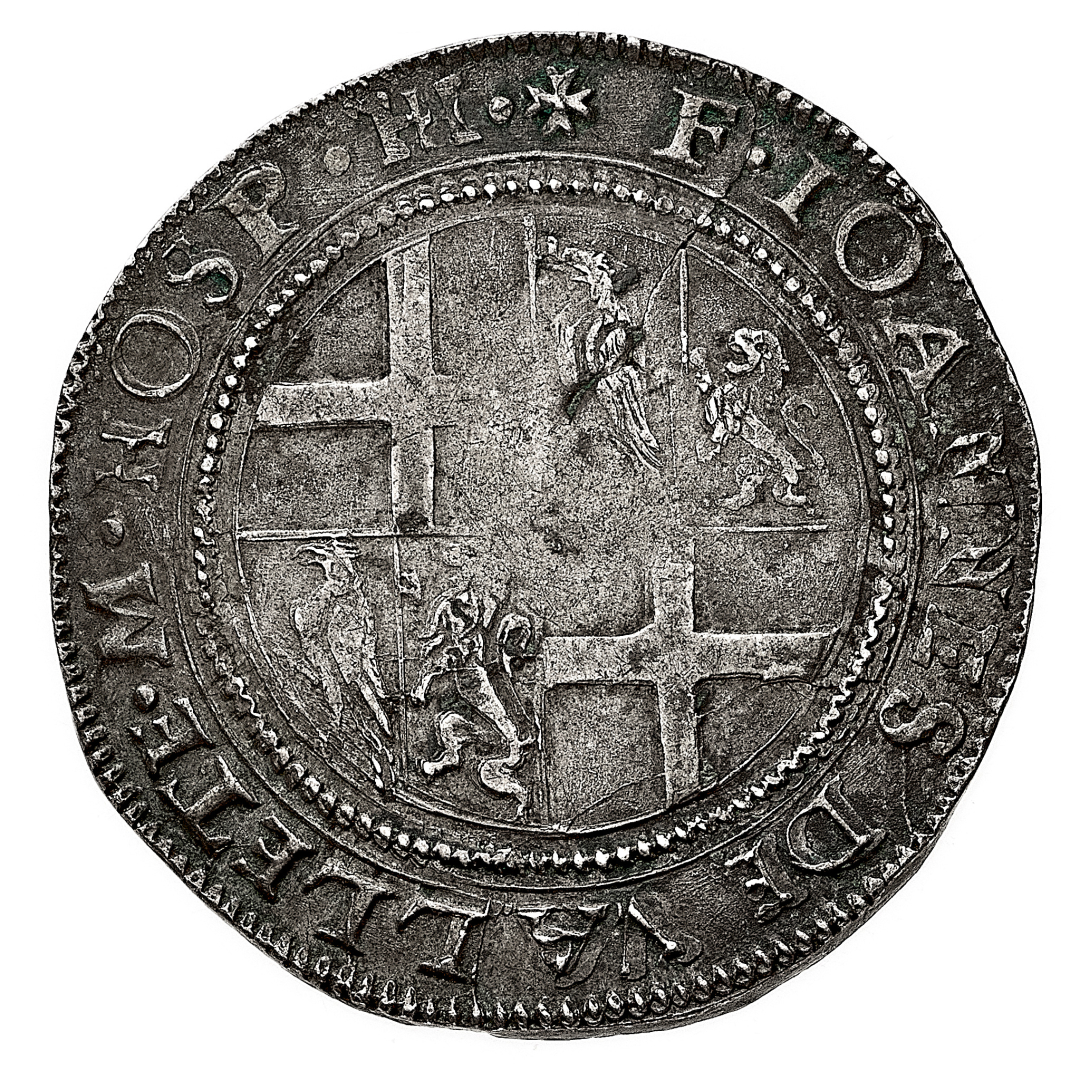 Jean de la Vallette (1557-1568) - 3 Tarì - Diritto: stemma - Rovescio: croce - gr. 8,46 - Rara - Lievi depositi e frattura di conio, BB