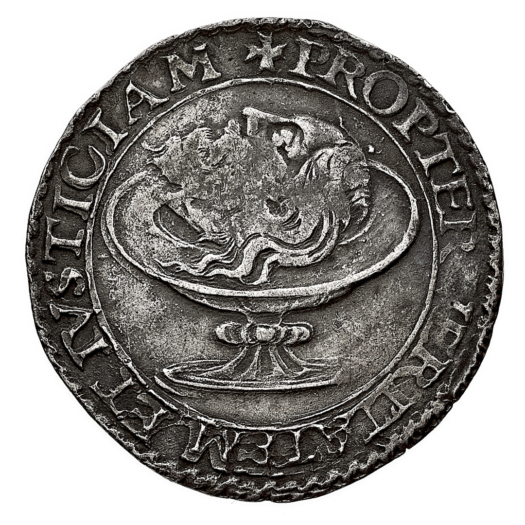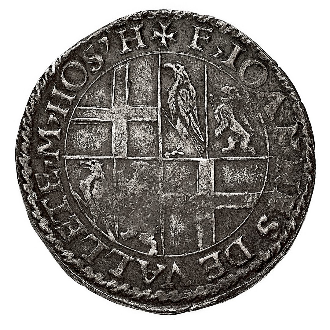 Jean de la Vallette (1557-1568) - 2 Tarì - Diritto: stemma - Rovescio: testa del Battista su un vassoio ovale rialzato - gr. 11,26 - Rara - Lievi debolezze di conio, migliore di BB