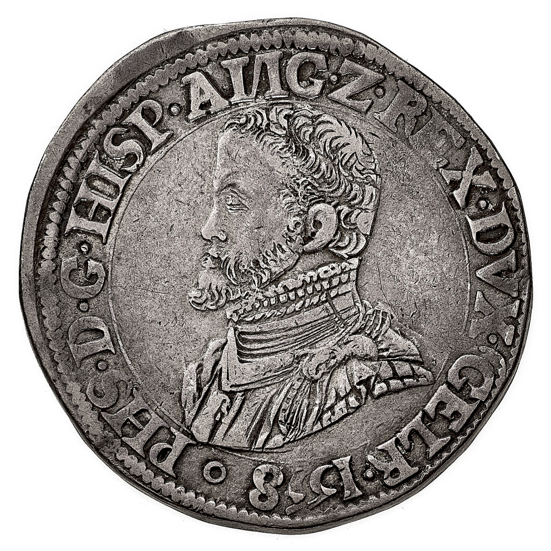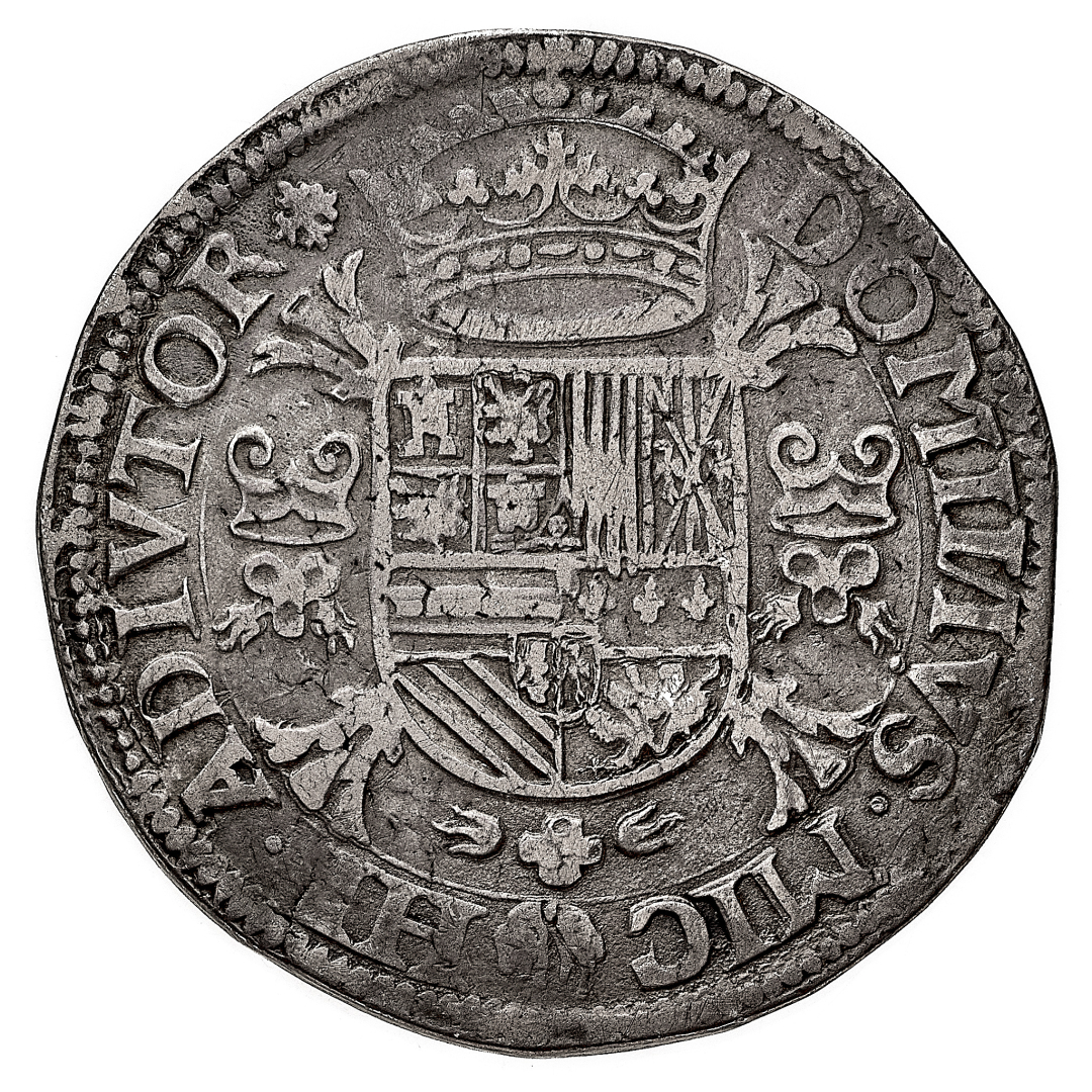 Filippo II di Spagna (1556-1598) - Philipsdaalder 1558 - Zecca: Bruges - Diritto: effigie di Filippo II a sinistra - Rovescio: stemma coronato e ornato - gr. 33,65 - BB