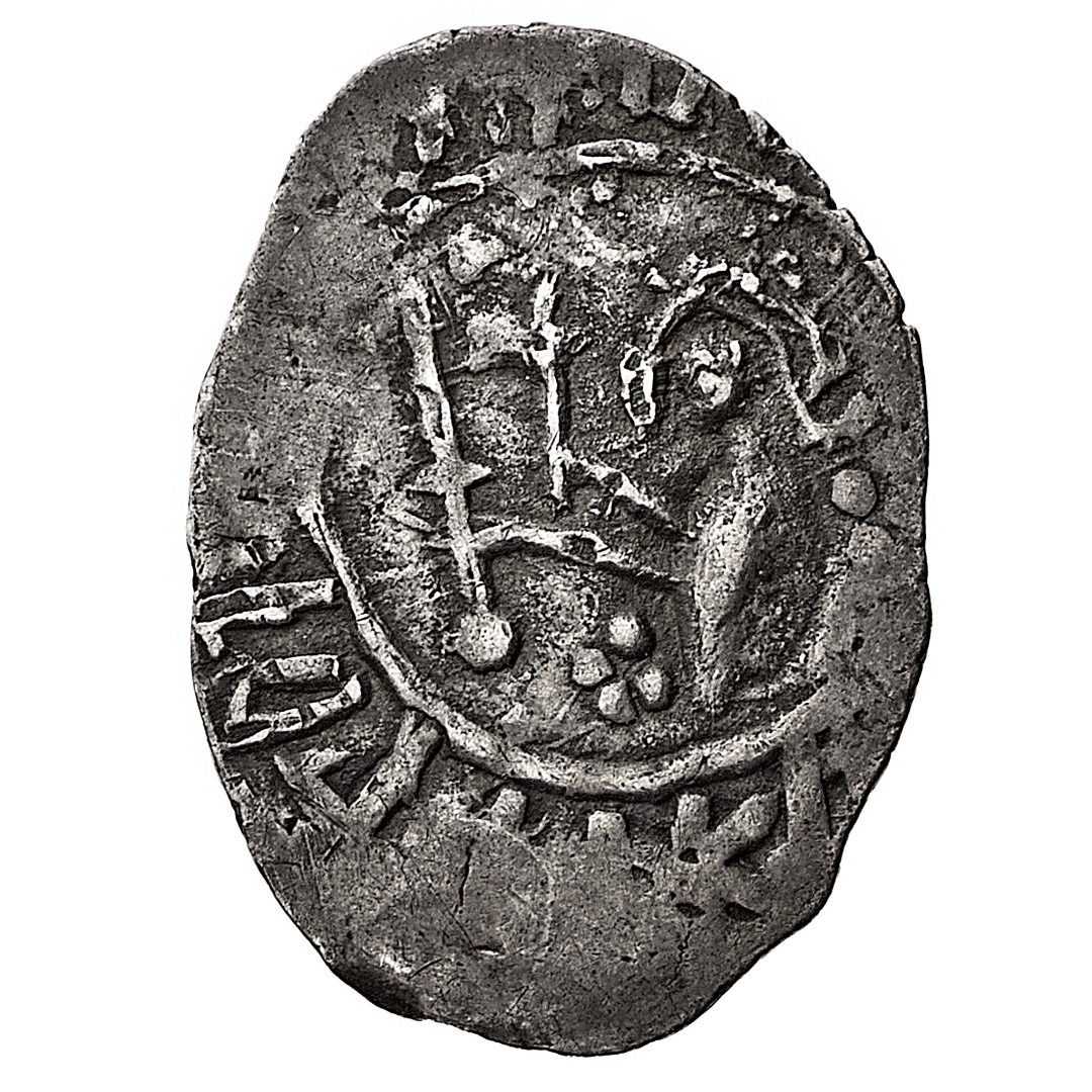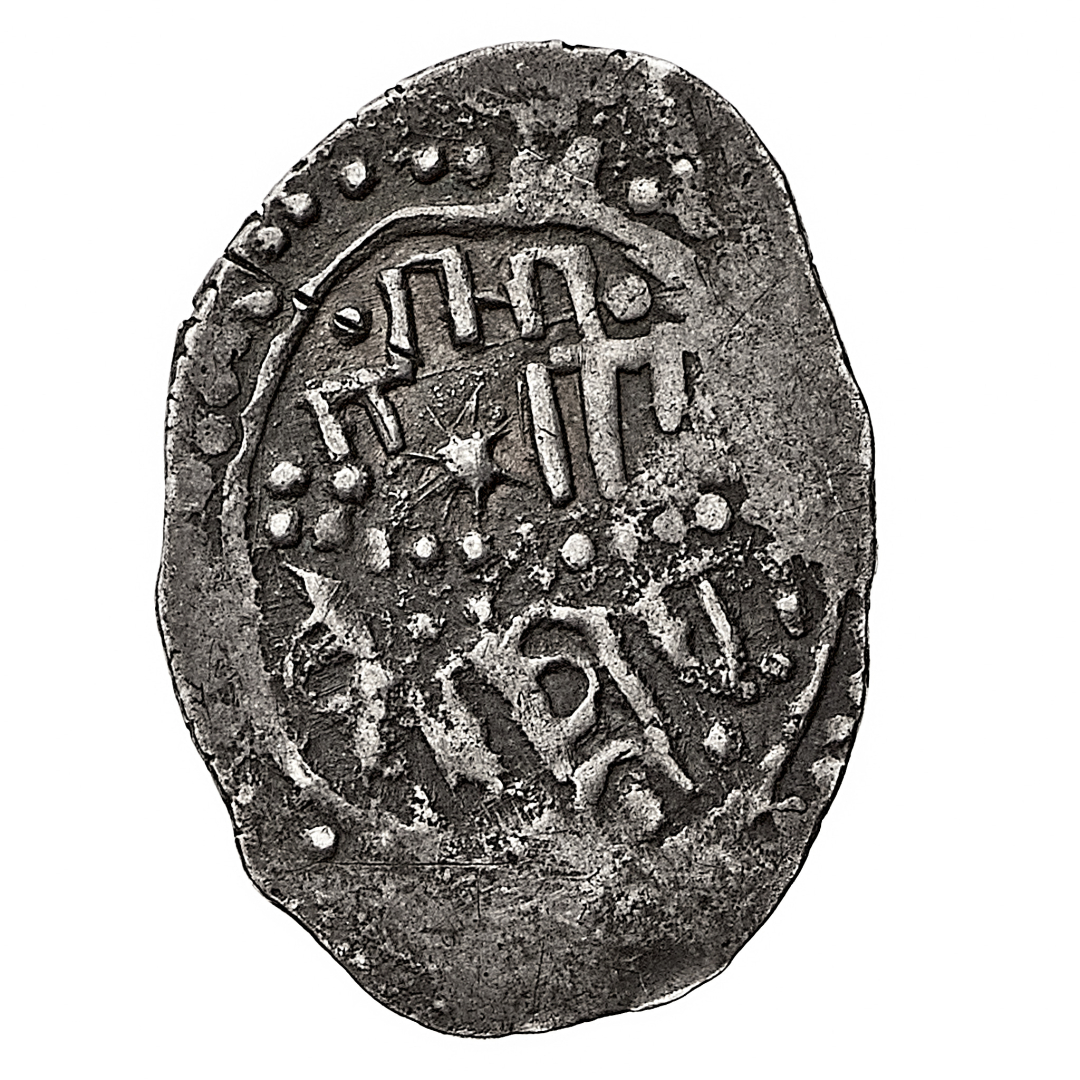 Dmitri Konstantinowitsch (1365-1383) - Denga - Diritto: guerriero a sinistra tiene con la mano sinistra una spada e con la destra un'ascia - Rovescio: legenda - gr. 0,90 - Rara - Lievi debolezze di conio, migliore di BB - Proveniente dall'asta Gorny&Mosch 178, Monaco di Baviera 13.3.2009, n. 6002