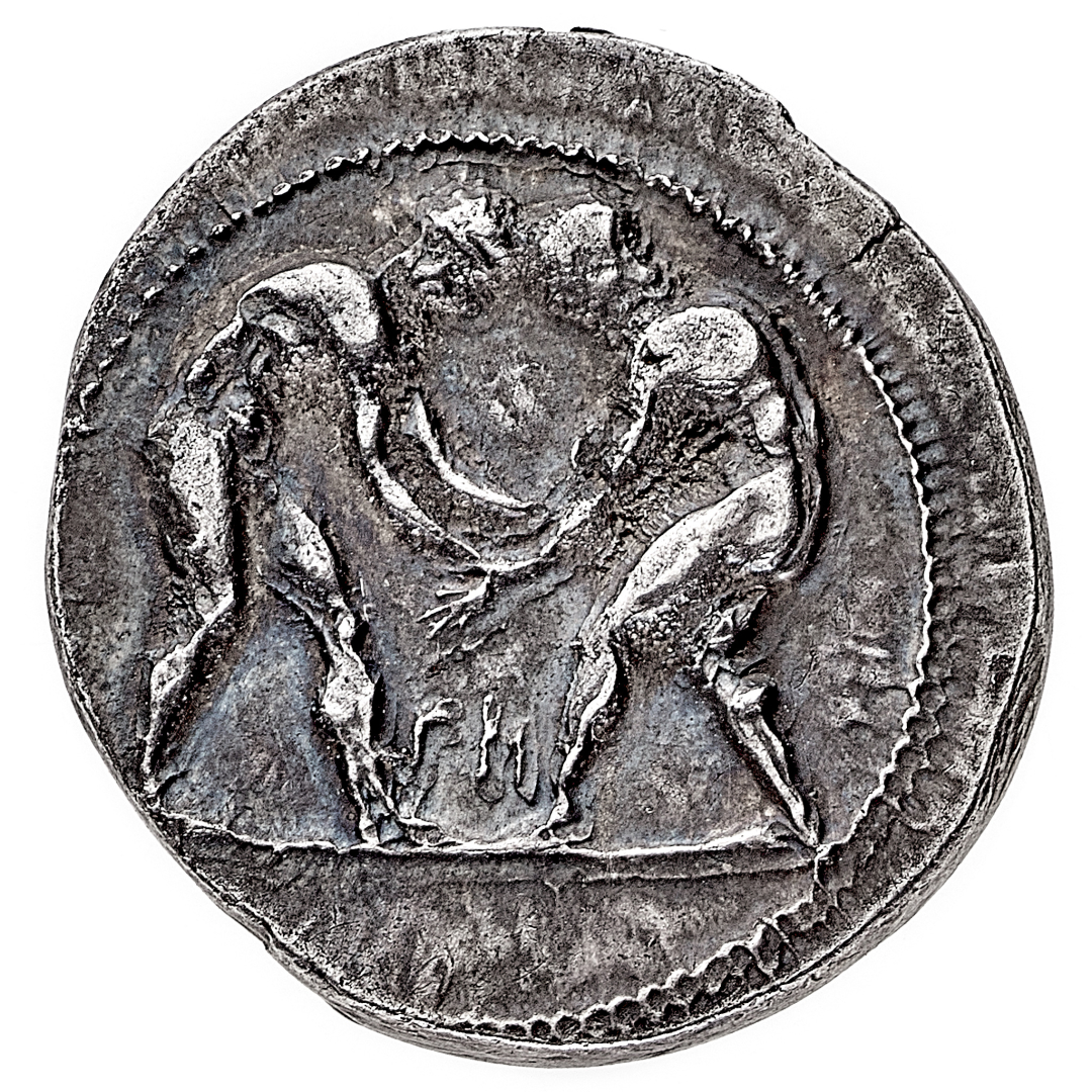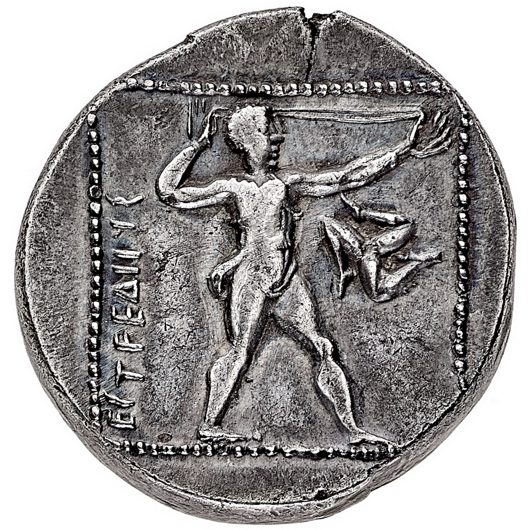 Aspendos - Statere databile al periodo 380-325 a.C. - Diritto: due lottatori - Rovescio: fromboliere nel lancio; una triscele nel campo a destra - gr. 10,75 - q.SPL