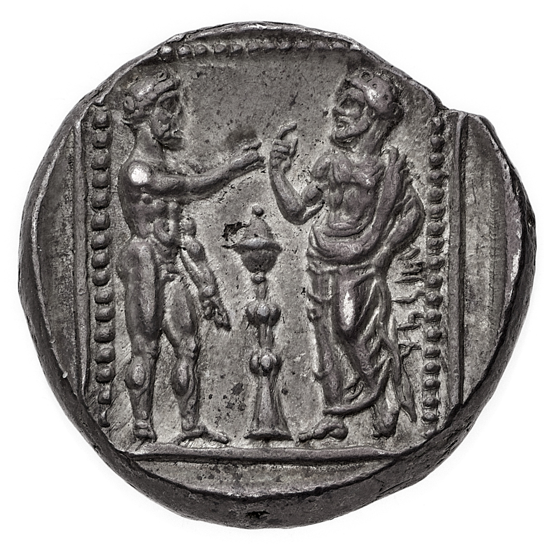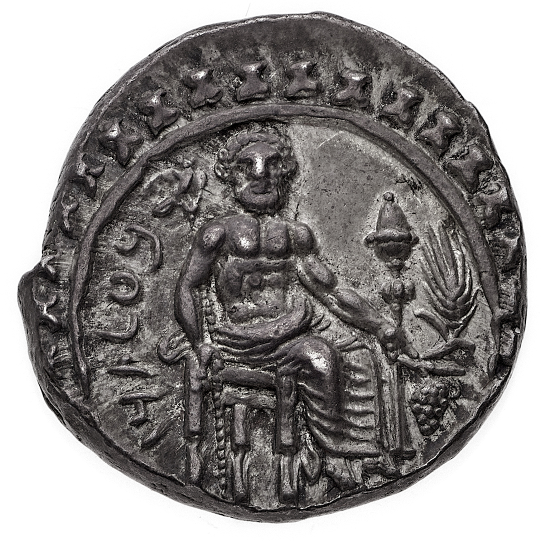Datames (378-372 a.C.) - Statere - Zecca: Tarsos - Diritto: il dio Baal seduto a destra con la testa di fronte, tiene un grappolo d'uva, una spiga di grano e un'aquila con la mano destra e uno scettro con la mano sinistra - Rovescio: Ana e Datames stanti affrontati; fra di loro un thymiaterion - gr. 10,87 - Patina di medagliere, SPL - Proveniente dall'asta Triton XII, New York 12.1.2004, n. 321 e dalla von Aulock Collection