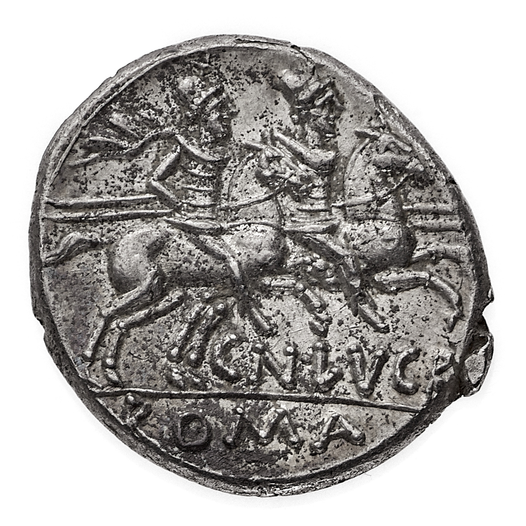 Denario al nome CN.LVCR TRIO databile al 136 a.C. - Zecca: Roma - Diritto: testa elmata di Roma a destra - Rovescio: i Dioscuri al galoppo verso destra con la lancia nella mano destra - gr. 3,95 - Fondi lucenti, q.FDC