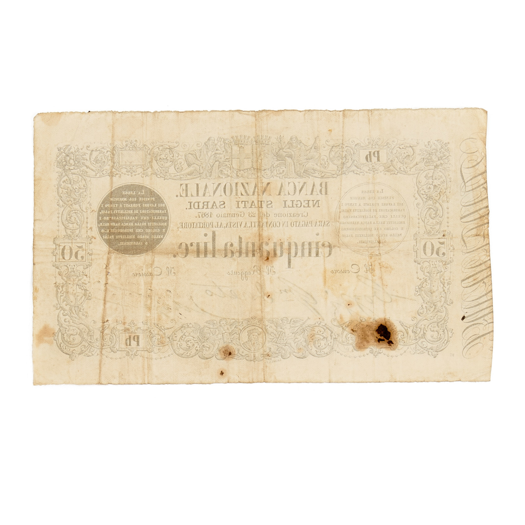 Banca Nazionale negli Stati Sardi - Biglietto da 50 Lire - Creazione del 23.1.1867 - Molto raro - Usuali pieghe e fori di spillatura. Alcune macchie della carta, BB