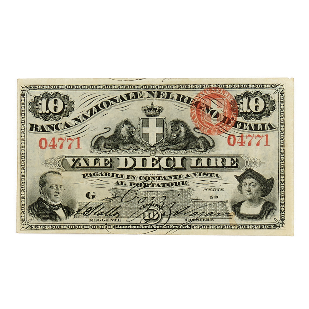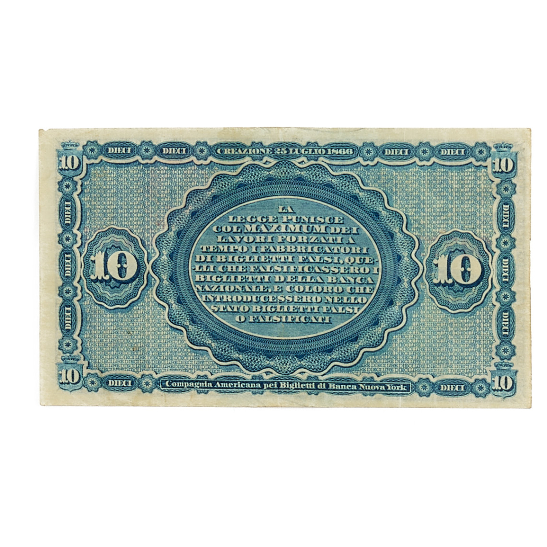 Banca Nazionale nel Regno d'Italia - Biglietto da 10 Lire - Creazione del 25.7.1866 - Lievi pieghe, fori di spillatura, migliore di BB - In lotto con altri due biglietti da 10 Lire rispettivamente 12.6.1866 e 24.1.1868 di qualità analoga