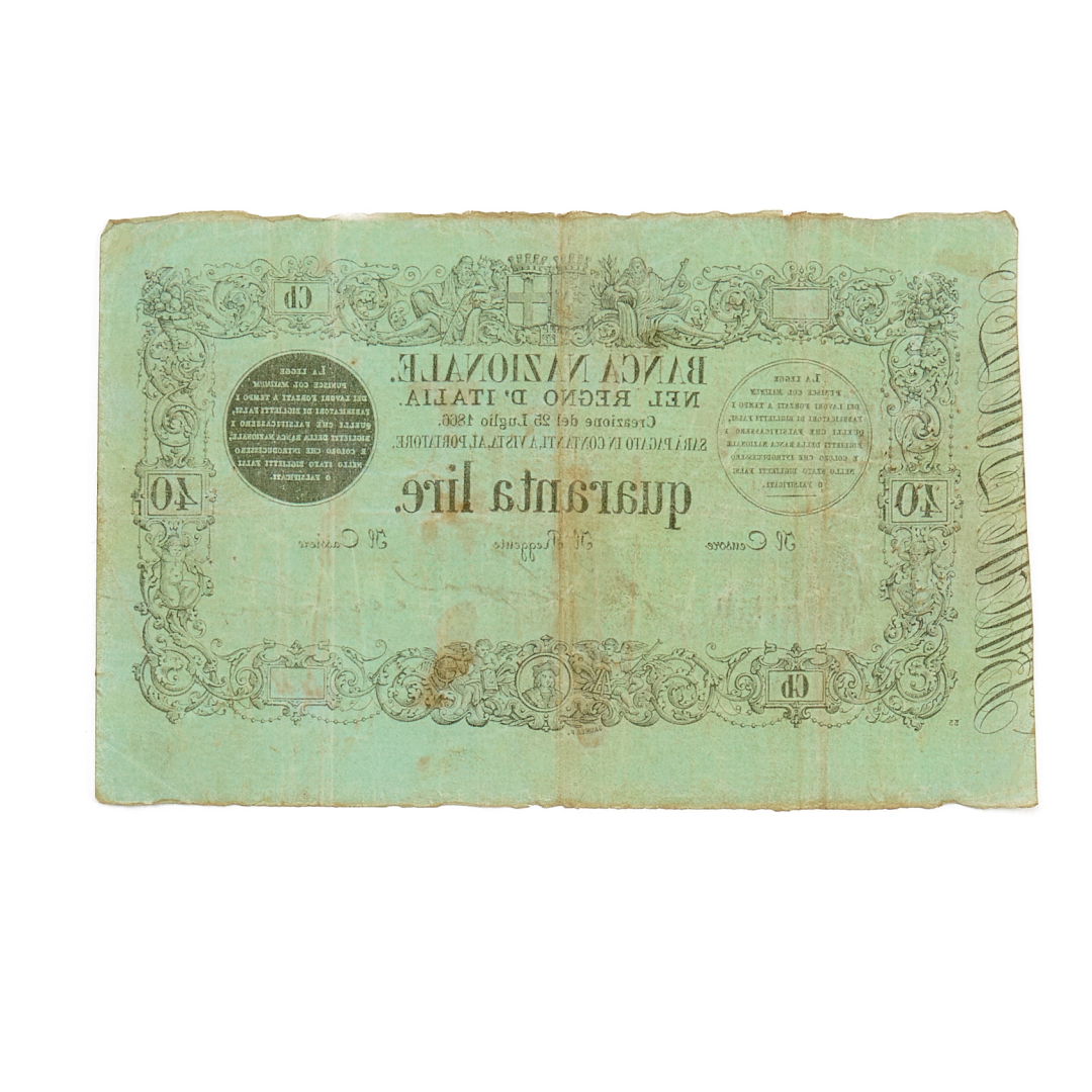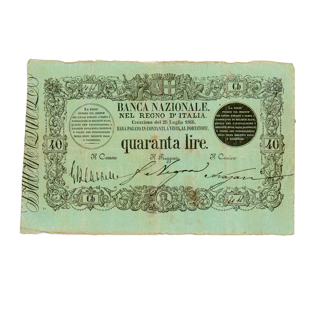 Banca Nazionale nel Regno d'Italia - Biglietto da 40 Lire - D.M. 25.7.1866 - Molto raro - Fori di spillatura e pieghe, ma esemplare genuino, BB