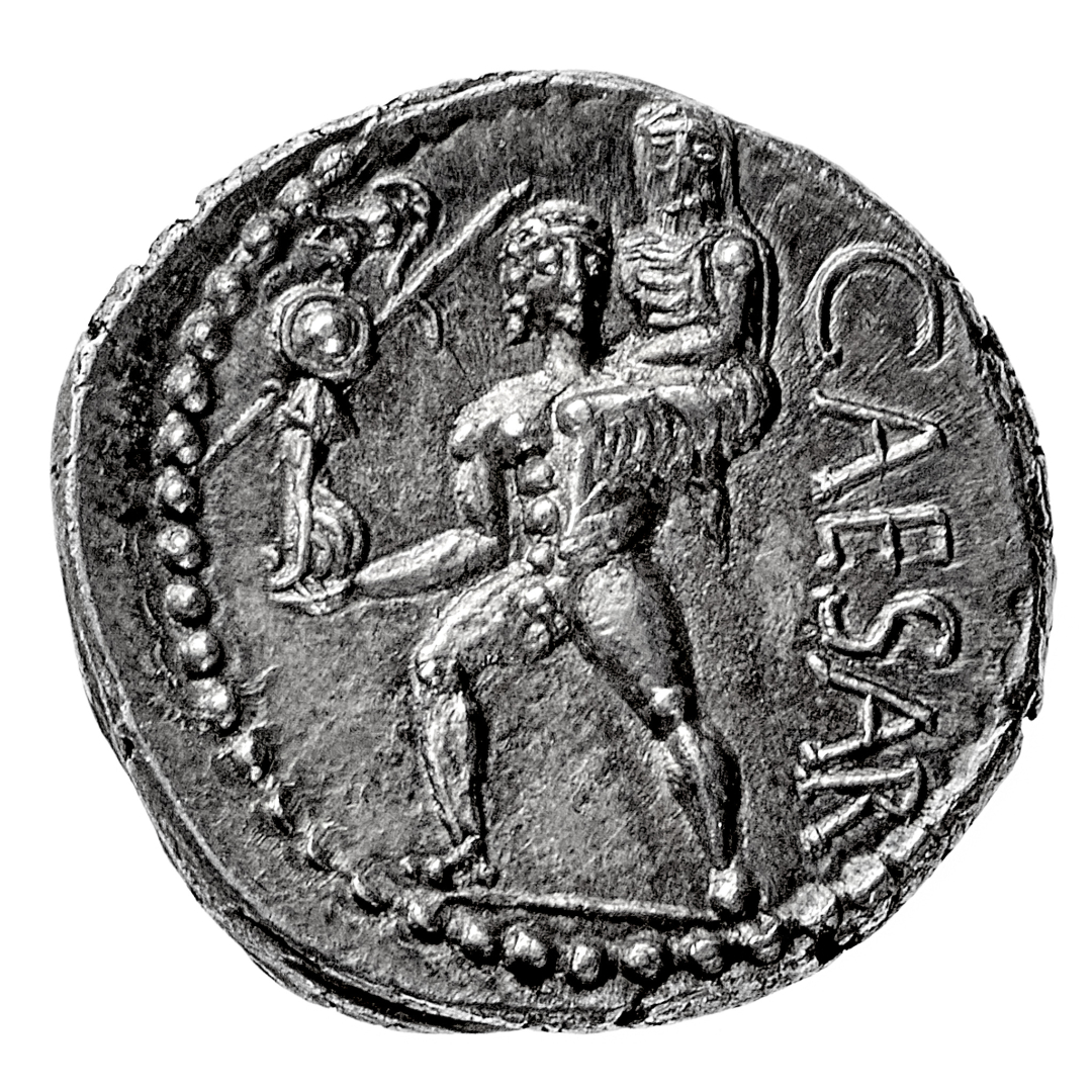 Giulio Cesare - Denario databile agli anni 47-46 a.C. - Zecca: città indeterminata del Nord Africa - Diritto: testa di Venere a destra - Rovescio: Enea sorregge il palladio con la mano destra e il padre Anchise con la sinistra - gr. 3,92 - Rara in questo stato di conservazione - Riflessi iridescenti, SPL - Da un appunto del collezionista, proveniente dal listino De Falco 18, n. 304