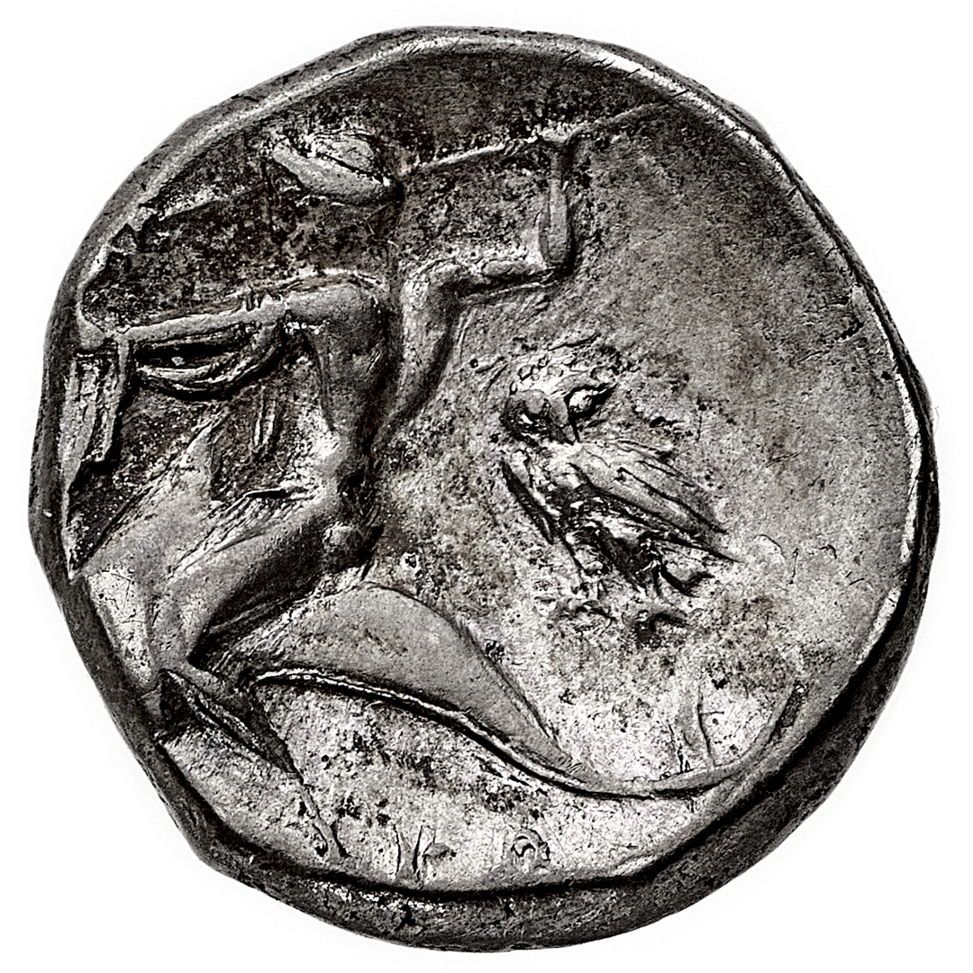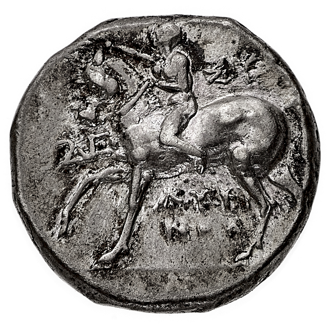 Taranto - Didramma databile al periodo 272-235 a.C. - Diritto: giovane cavaliere incorona il cavallo al passo verso sinistra - Rovescio: Taras, in groppa al delfino verso sinistra, tiene un tridente con la mano destra e la sinistra protesa in avanti; nel campo, a destra, una civetta - gr. 6,44 - q.SPL