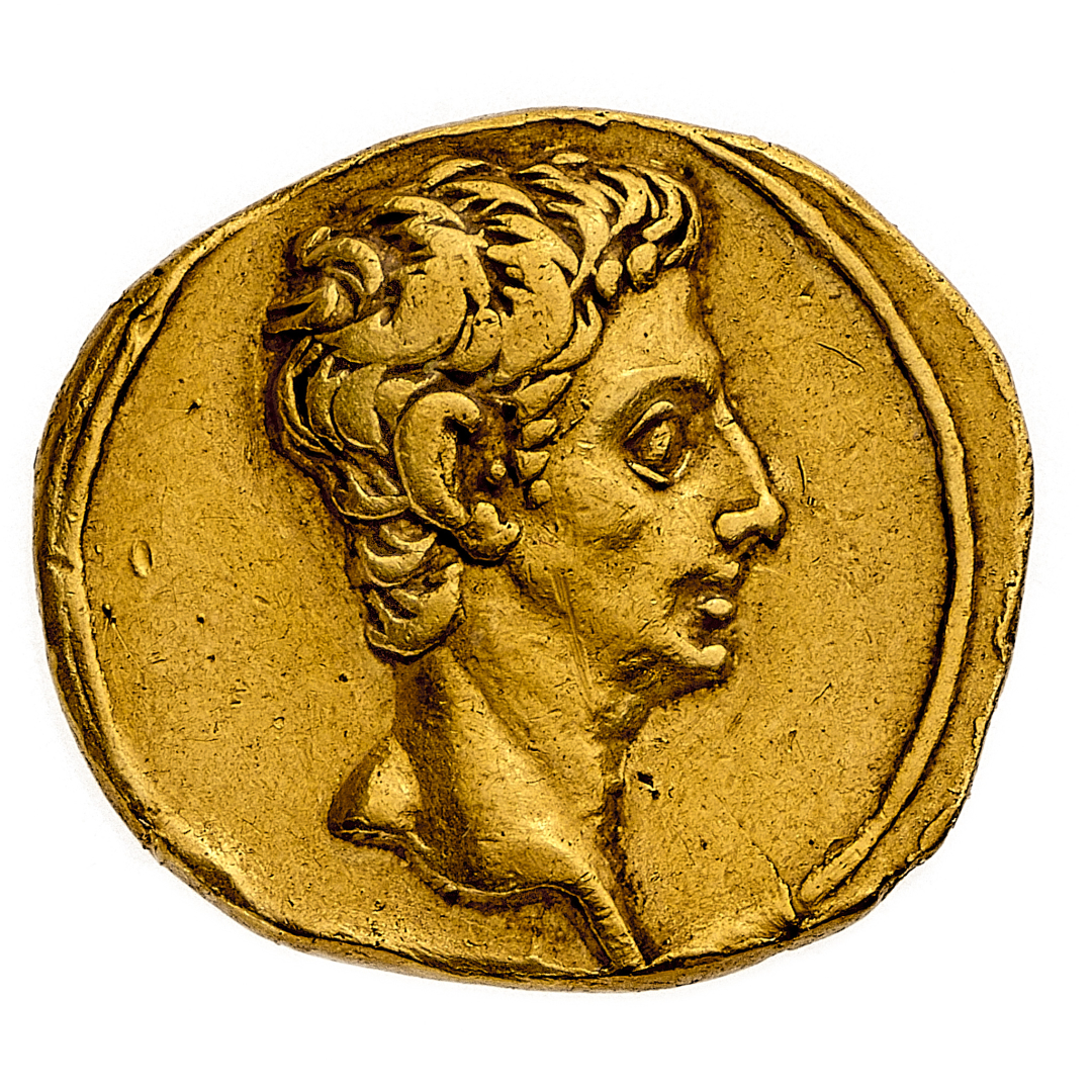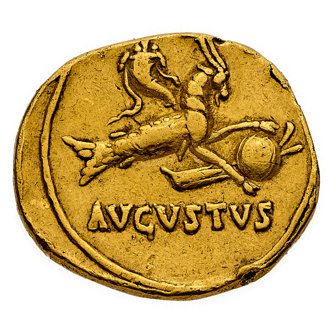 Aureo databile al periodo 18-16 a.C. - Zecca: Colonia Patricia - Diritto: testa dell'Imperatore a destra - Rovescio: Capricorno con globo e cornucopia verso destra, sotto timone - gr. 7,70 - Rara - Probabili tracce di montatura, comunque migliore di BB