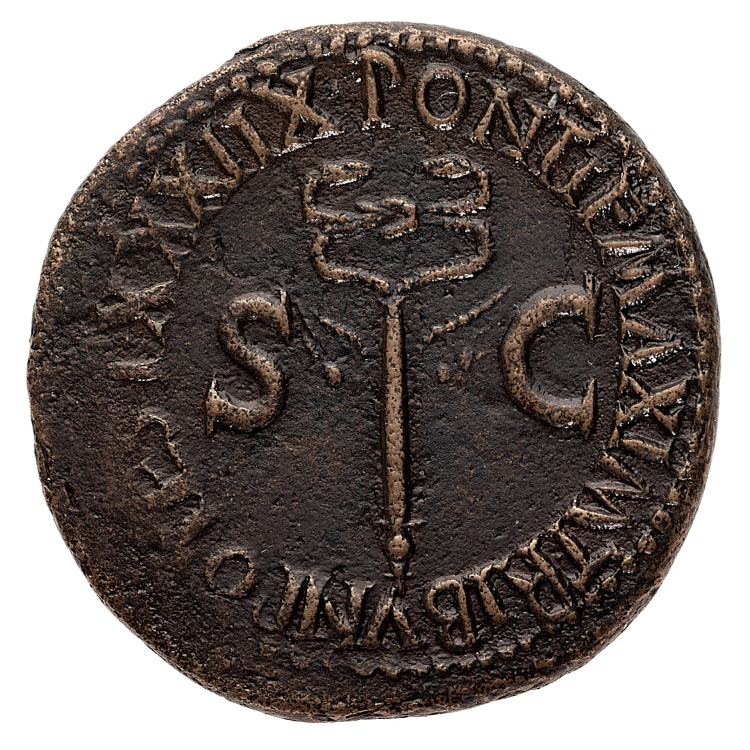 Asse databile agli anni 35-36 d.C. - Zecca: Roma - Diritto: testa laureata dell'Imperatore a sinistra - Rovescio: caduceo alato - gr. 10,86 - Rara - BB