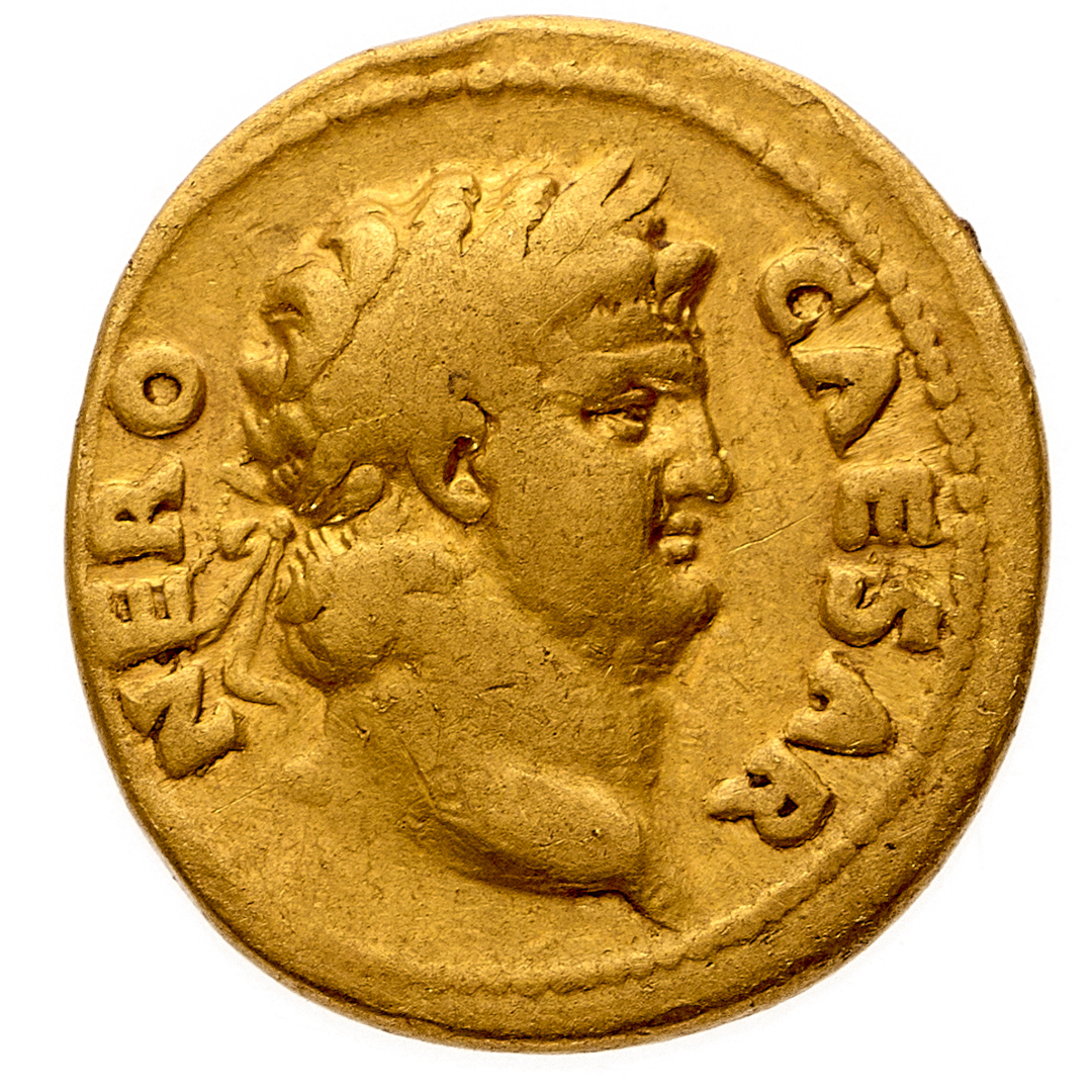 Aureo databile agli anni 64-65 d.C. - Zecca: Roma - Diritto: testa laureata dell'Imperatore a destra - Rovescio: l'Imperatore radiato e togato stante di fronte, tiene un ramoscello con la mano destra e una piccola Vittoria con la sinistra - gr. 7,10 - BB