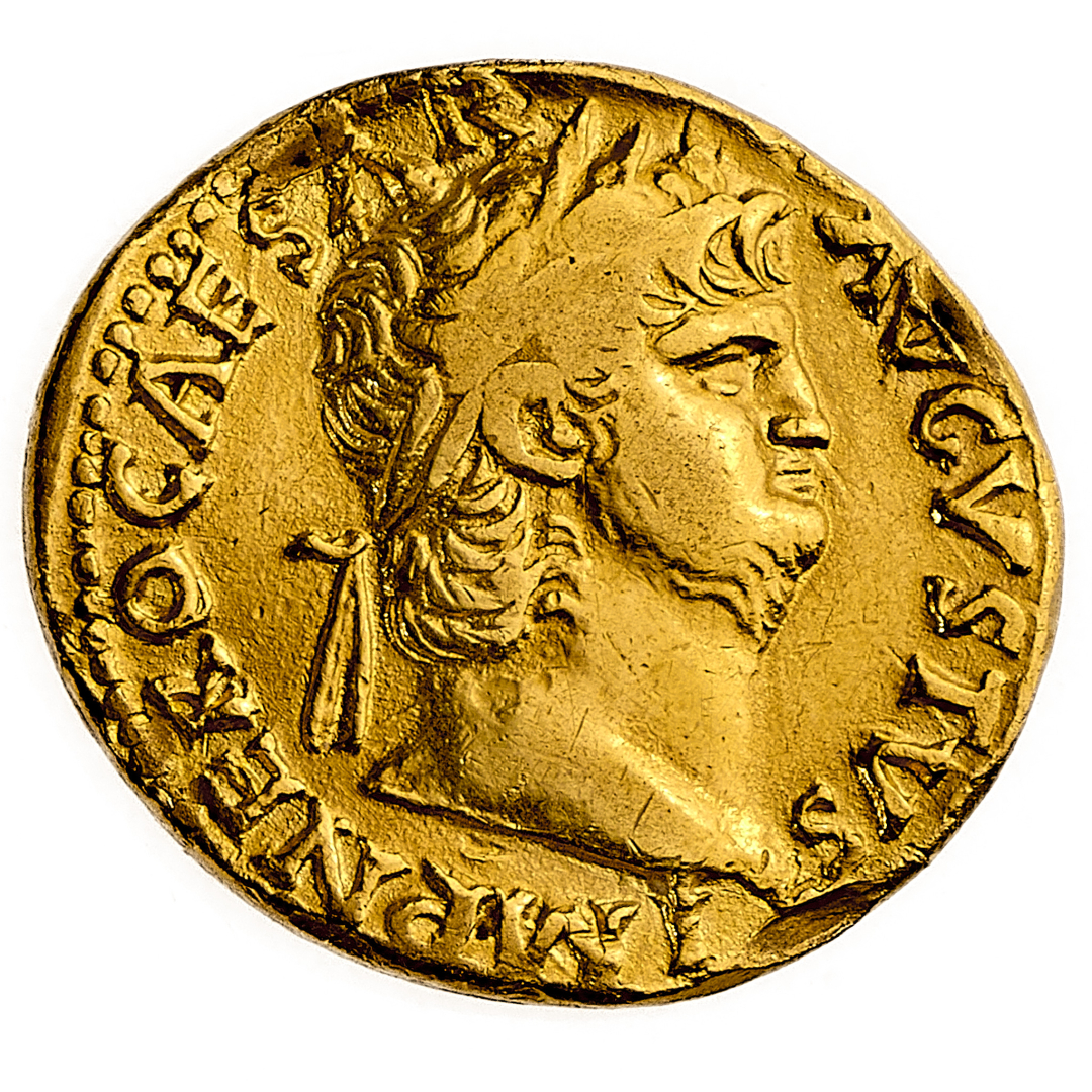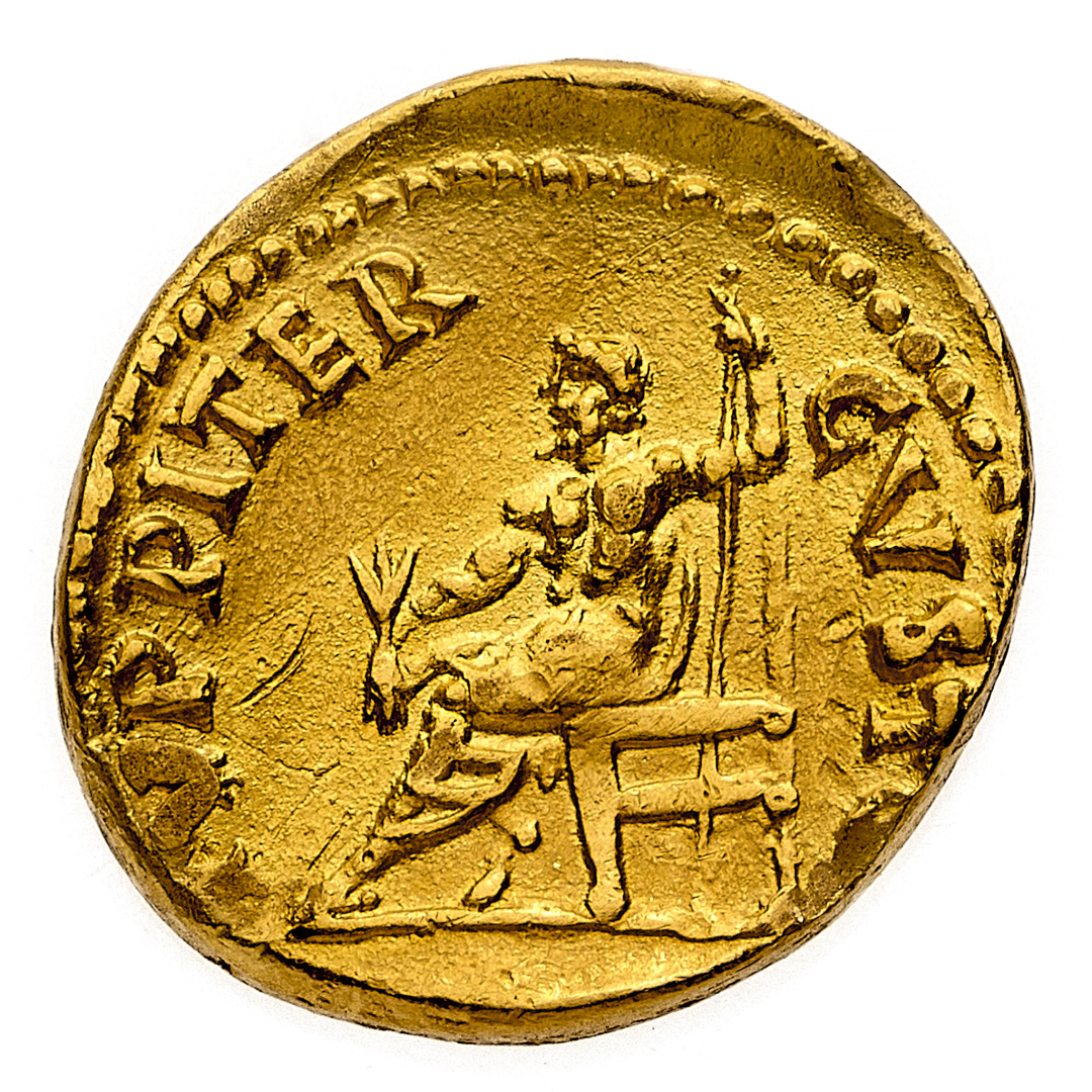 Aureo databile agli anni 64-65 d.C. - Zecca: Roma - Diritto: testa laureata dell'Imperatore a destra - Rovescio: Giove seduto a sinistra tiene un fulmine con la mano destra e un lungo scettro verticale con la sinistra - gr. 6,74 - Tracce di montatura e ondulazioni del tondello, q.BB