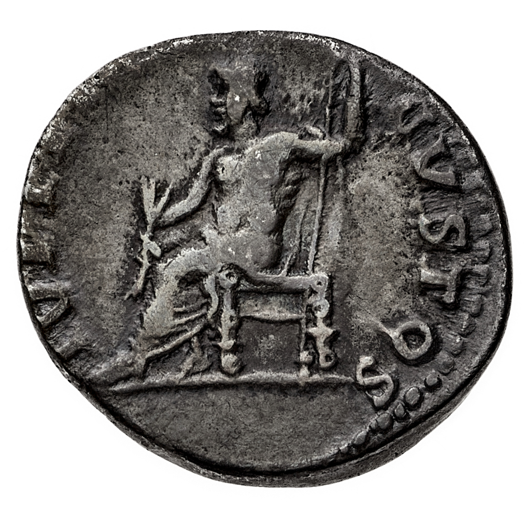 Denario databile al periodo 64-66 d.C. - Zecca: Roma - Diritto: testa laureata dell'Imperatore a destra - Rovescio: Giove seduto a sinistra, tiene un fulmine con la mano destra e un lungo scettro verticale con la sinistra - gr. 3,29 - Patina iridescente, BB