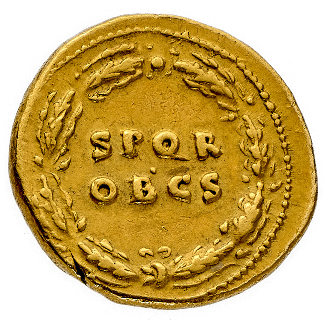 Aureo - Zecca: Roma - Diritto: testa dell'Imperatore a destra - Rovescio: legenda su due righe orizzontali entro una corona di quercia - gr. 7,34 - Rara - q.SPL