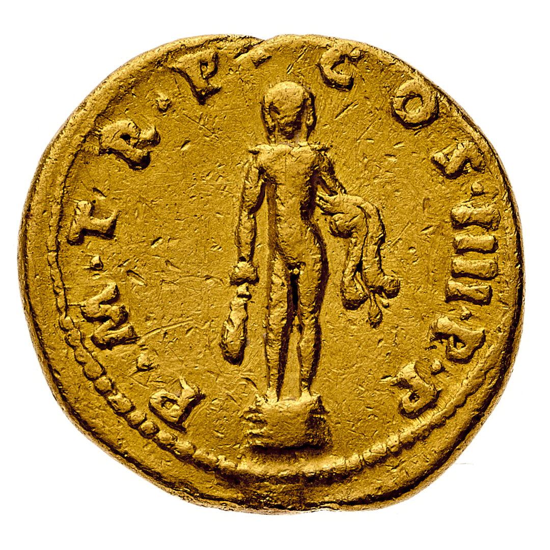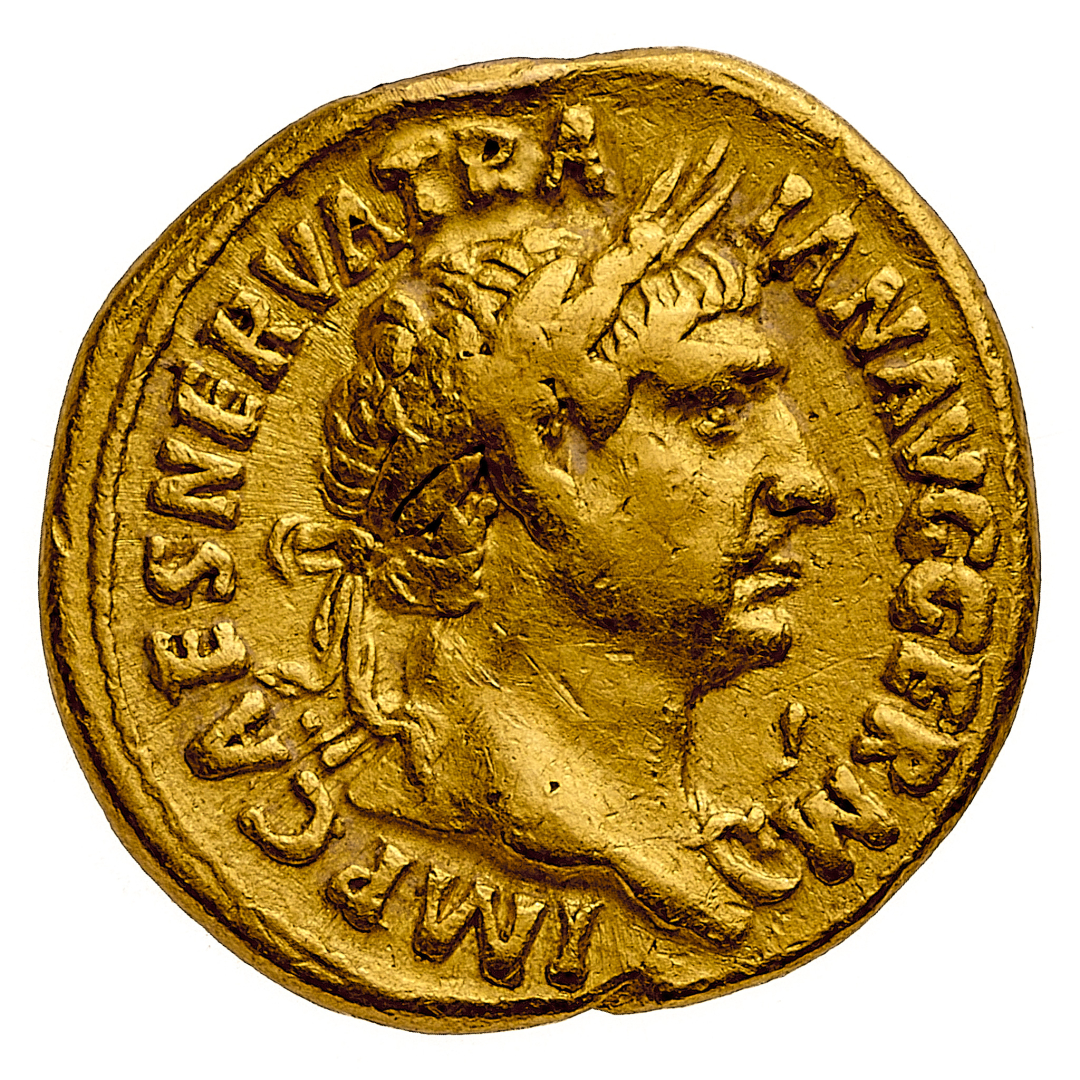 Aureo databile agli anni 101-102 d.C. - Zecca: Roma - Diritto: testa laureata dell'Imperatore a destra con l'egida sul collo - Rovescio: Ercole stante di fronte su un piedistallo tiene una clava con la mano destra e la pelle del leone con la sinistra - gr. 7,25 - BB